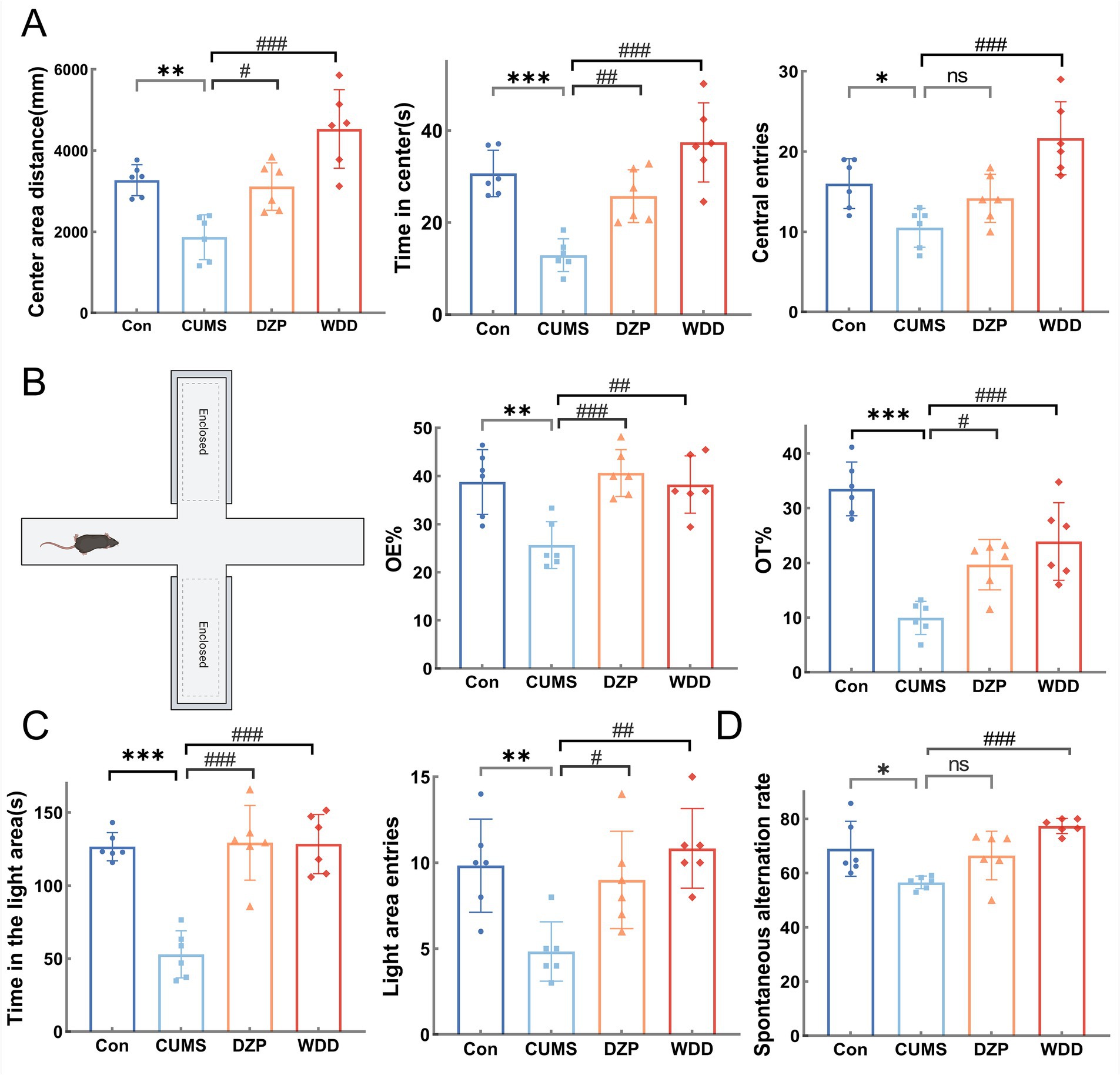 Figure 3. Effects of WDD on anxiety-like behaviors. (A) Results of the OFT experiment (n = 6). (B) Results of the EPM test (n = 6). (C) Results of the LDB test (n = 6). (D) Results of the Y-Maze test (n = 6). *p < 0.05, **p < 0.01, ***p < 0.001 vs. Con group; #p < 0.05, ##p < 0.01, ### p < 0.001 vs. CUMS model group; ns, not significant.