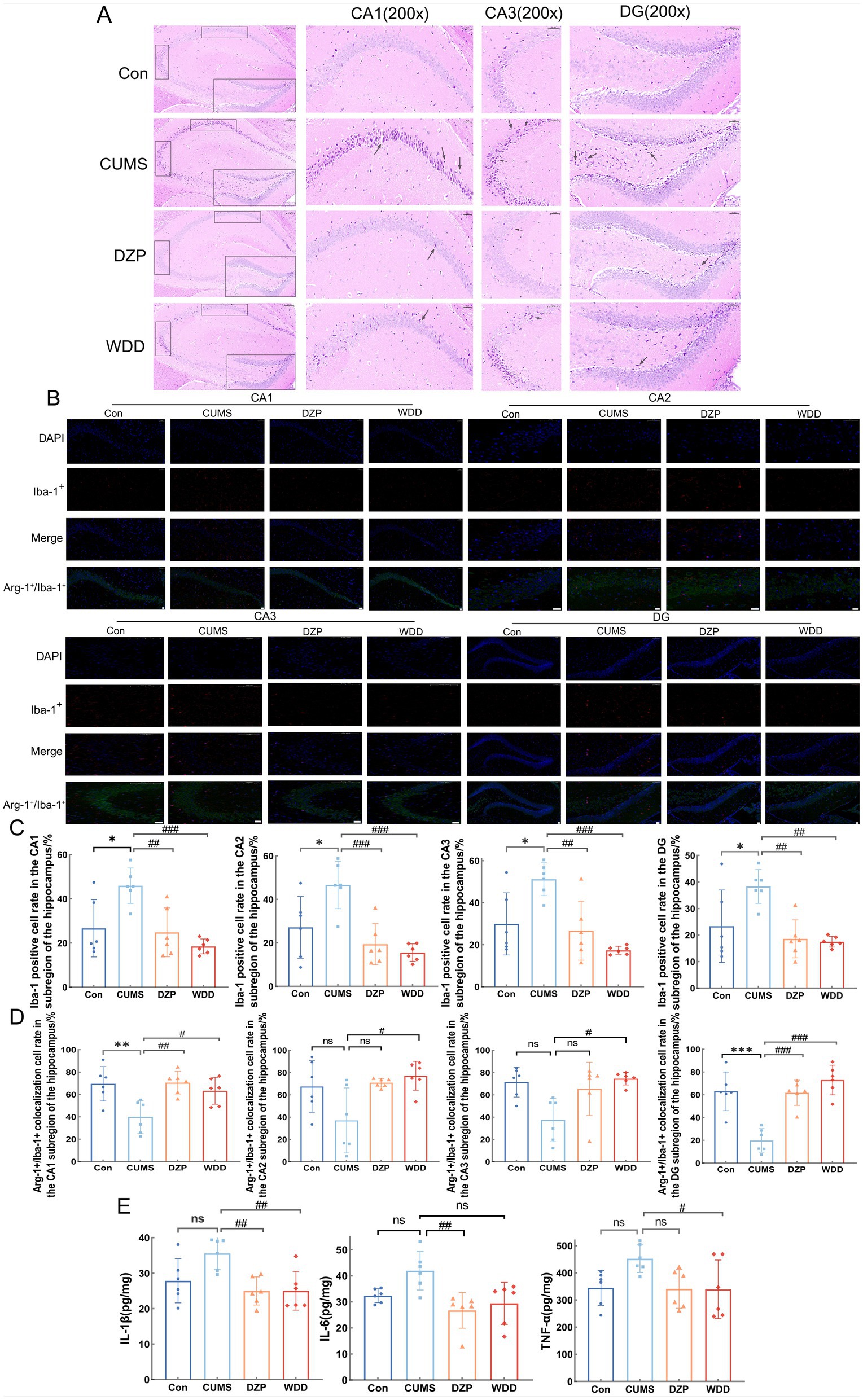 Figure 4. Effects of WDD on morphological alterations and neuroinflammation in the hippocampus. (A) Results of the hippocampal tissue H&E staining. CA1, CA3, and DG were chosen for comparison (n = 6). (B) Immunofluorescence staining results of hippocampus in Con, CUMS, DZP, and WDD groups. Iba-1+ cells are seen in red, Arg-1+ cells in green, and nuclei are stained with DAPI, resulting in a blue appearance. Scale bar = 100 μm. (C) Quantification of the Iba-1+ cell in the hippocampus (n = 6). (D) Quantification of the Arg-1+/Iba-1+ colocalization cells in the hippocampus (n = 6). (E) Hippocampal levels of pro-inflammatory cytokines (IL-1β, IL-6, and TNF-α) (n = 6). *p < 0.05, **p < 0.01, ***p < 0.001 vs. Con group; #p < 0.05, ##p < 0.01, ###p < 0.001 vs. CUMS model group; ns, not significant.