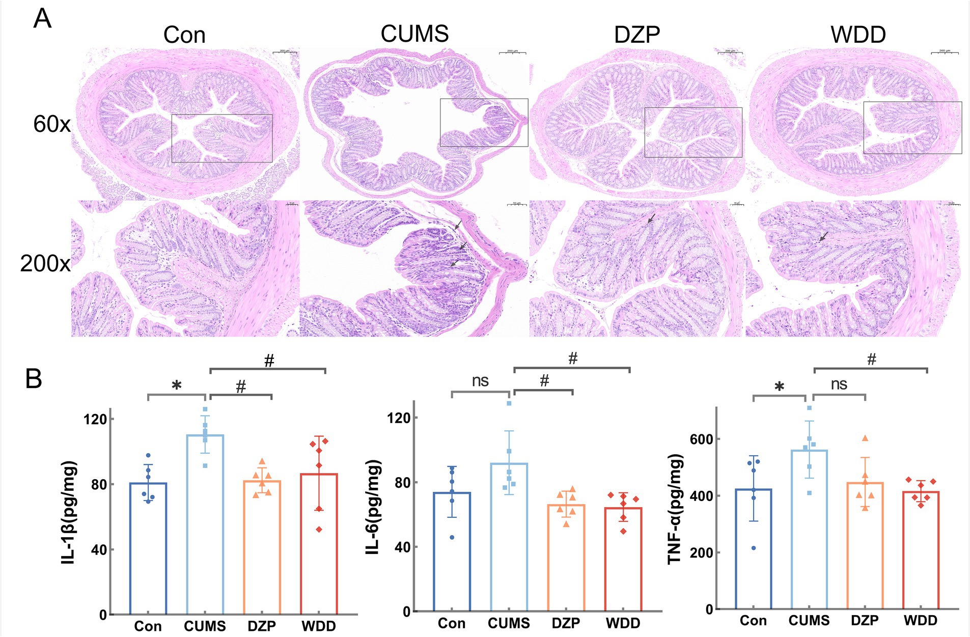 Figure 5. Effects of WDD on colonic inflammation. (A) H&E staining results of the effect of WDD on the colon pathology. (B) Effects of WDD on IL-1β, IL-6, and TNF-α levels of the colon (n = 6). *p < 0.05 vs. Con group; #p < 0.05 vs. CUMS model group; ns, not significant.