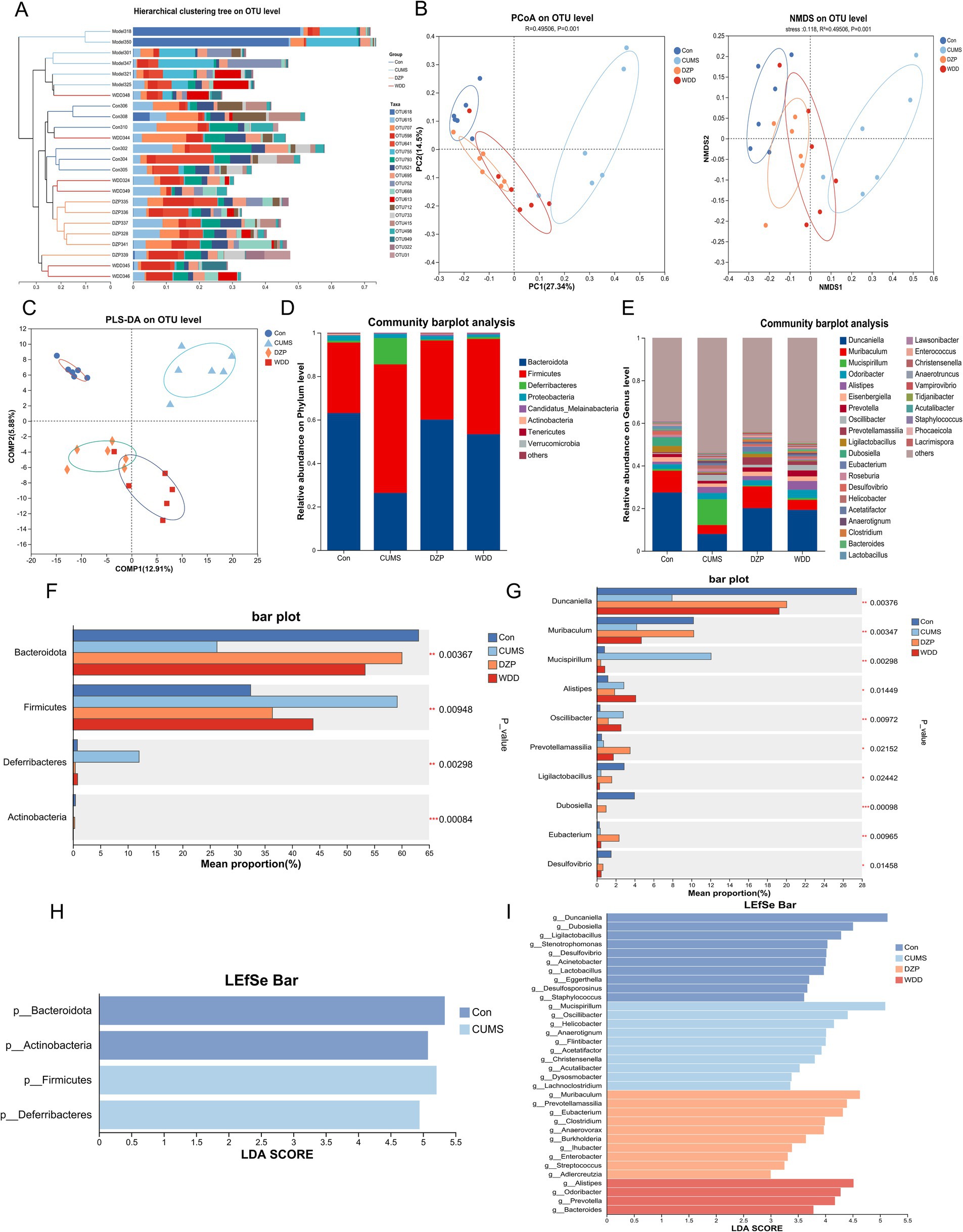 Multiple charts and graphs related to OTU (Operational Taxonomic Unit) levels and microbial community analysis. Panel A shows a hierarchical clustering tree. Panel B includes PCoA and NMDS plots. Panel C displays a PLS-DA plot. Panels D and E present community bar plot analyses by phylum. Panel F is a bar plot of mean proportions by group. Panel G offers another bar plot on mean proportions in detail. Panel H is a LEfSe bar graph with LDA scores, and Panel I shows a detailed LEfSe bar graph for various groups. Each panel analyzes microbiome data across different groups labeled Con, CUMS, D2P, and WDD.