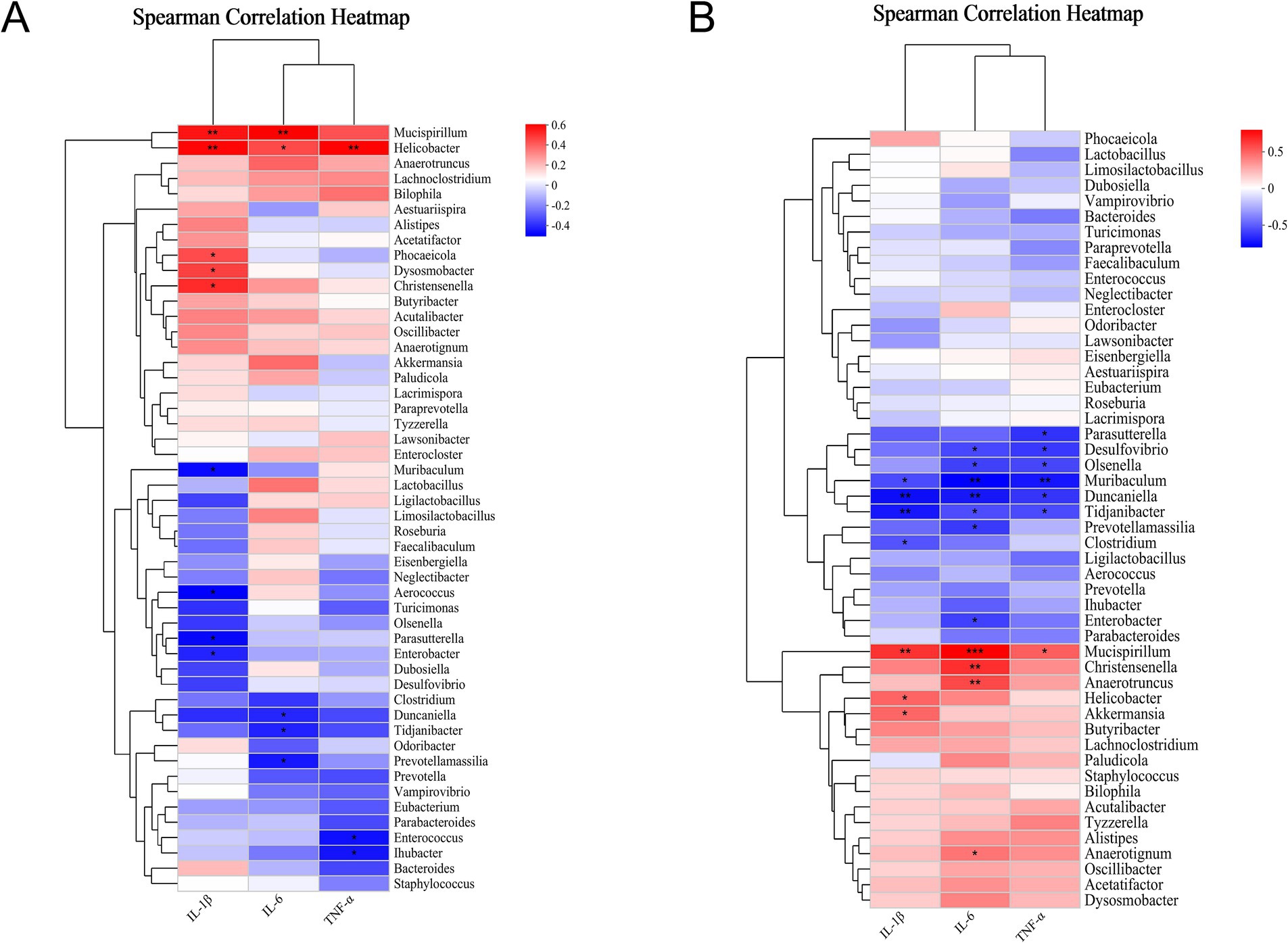 Two Spearman correlation heatmaps labeled A and B compare microbial genera with inflammatory markers IL-1β, IL-6, and TNF-α. Heatmap A shows a stronger positive correlation for Mucispirillum and Helicobacter, while Heatmap B highlights high negative correlations for Parasutrella and Clostridium. The color scale ranges from -0.4 to 0.6 in A, and -0.5 to 0.5 in B, with red indicating positive and blue negative correlations. Dendrograms illustrate clustering of genera based on correlation patterns.