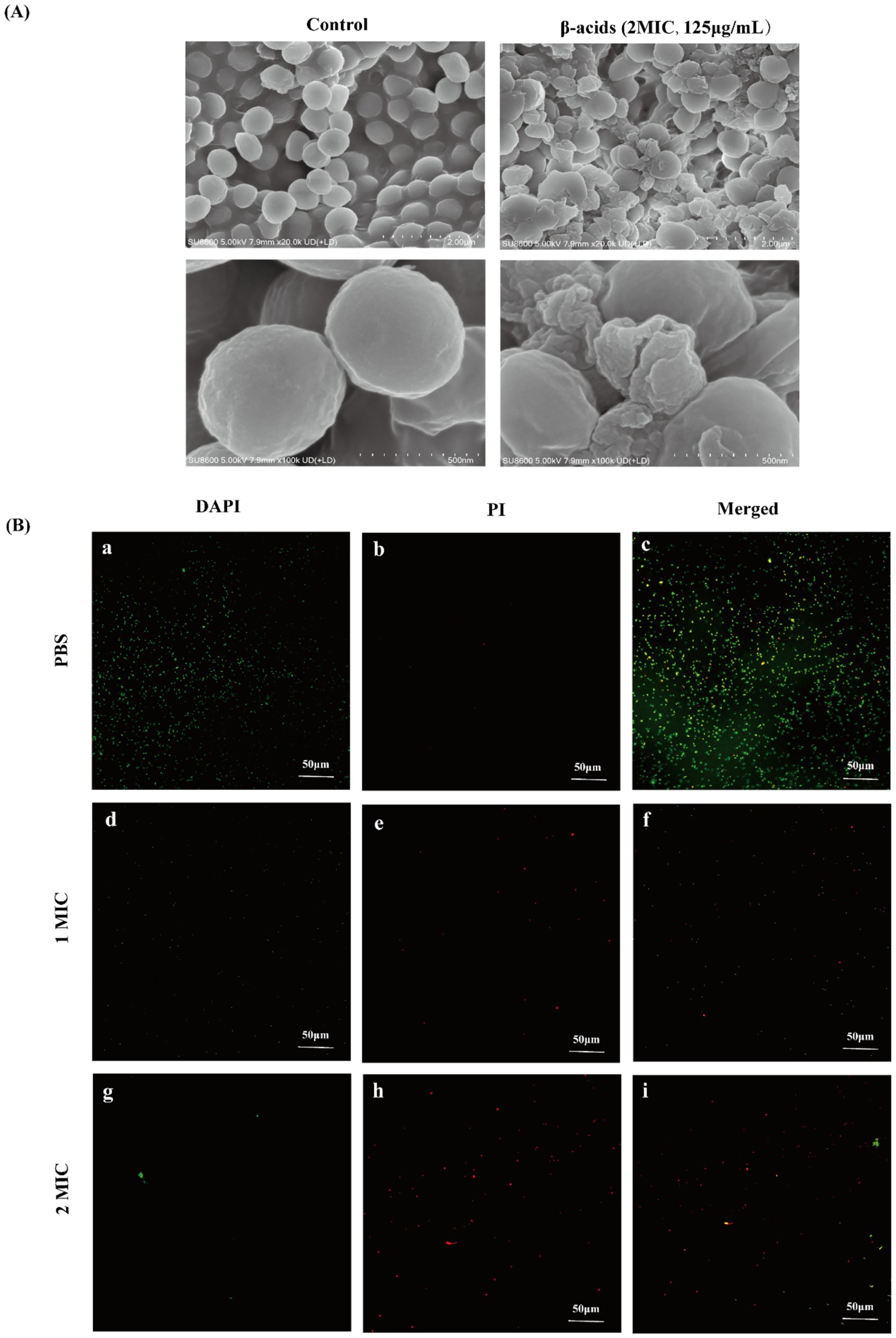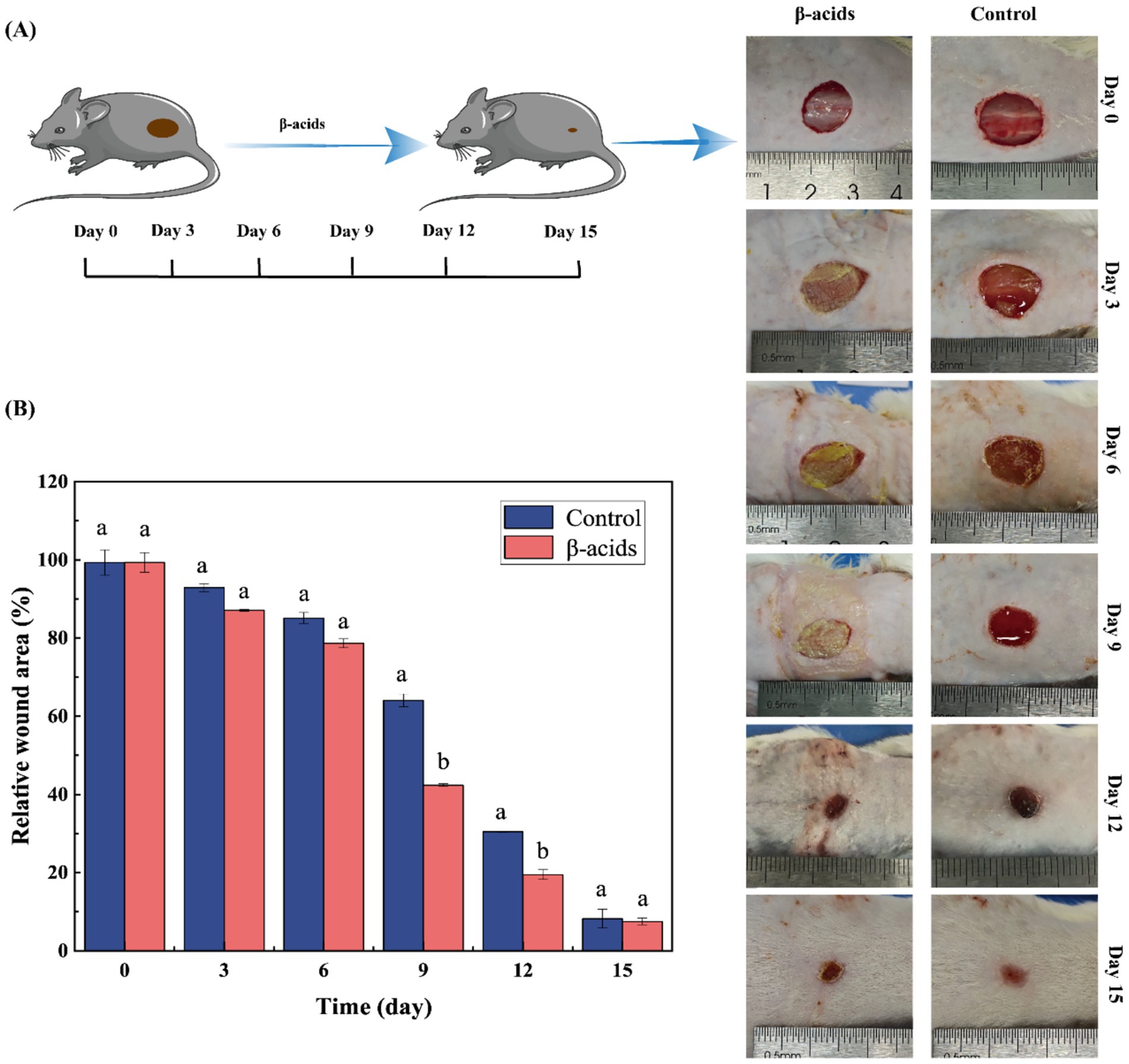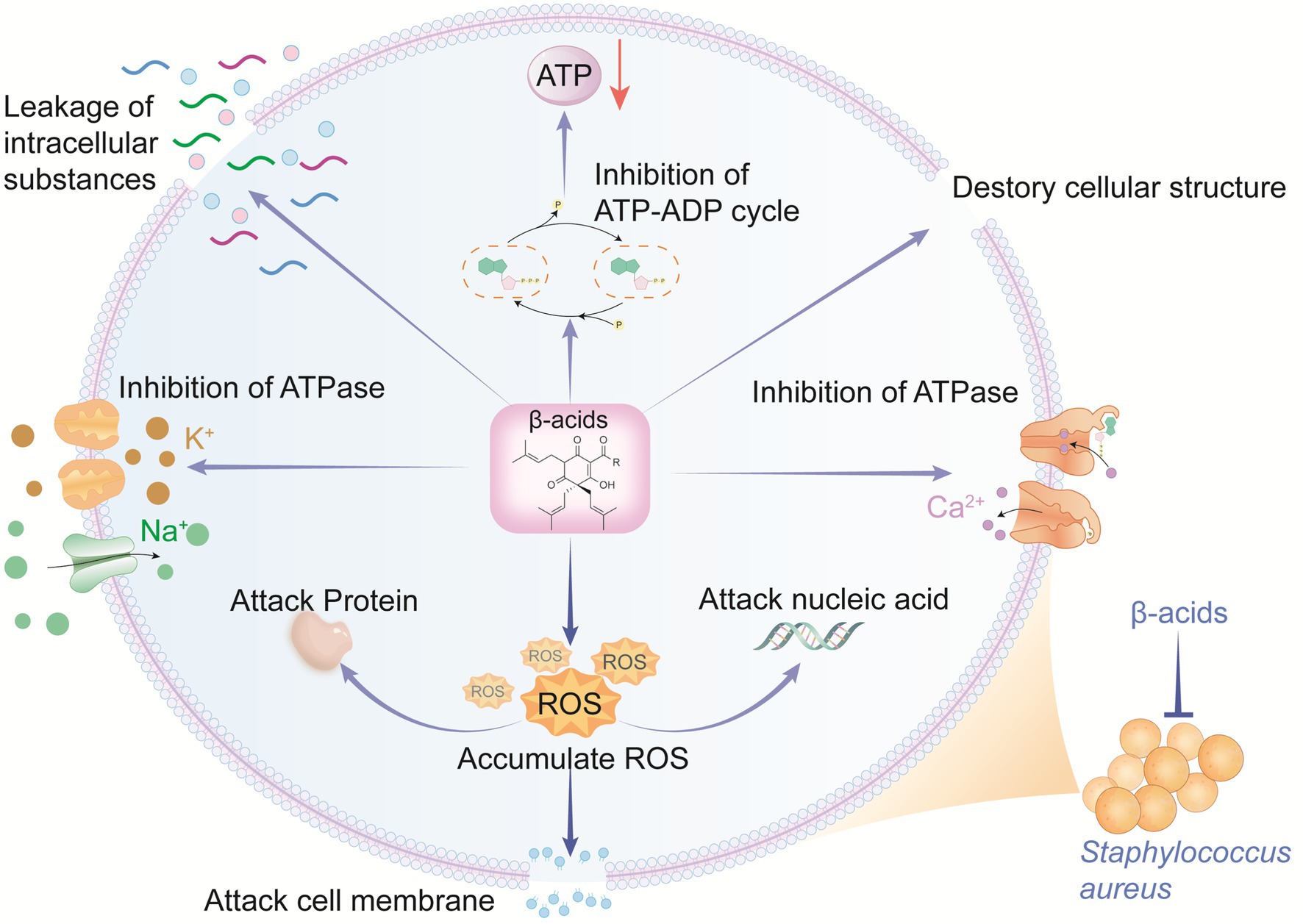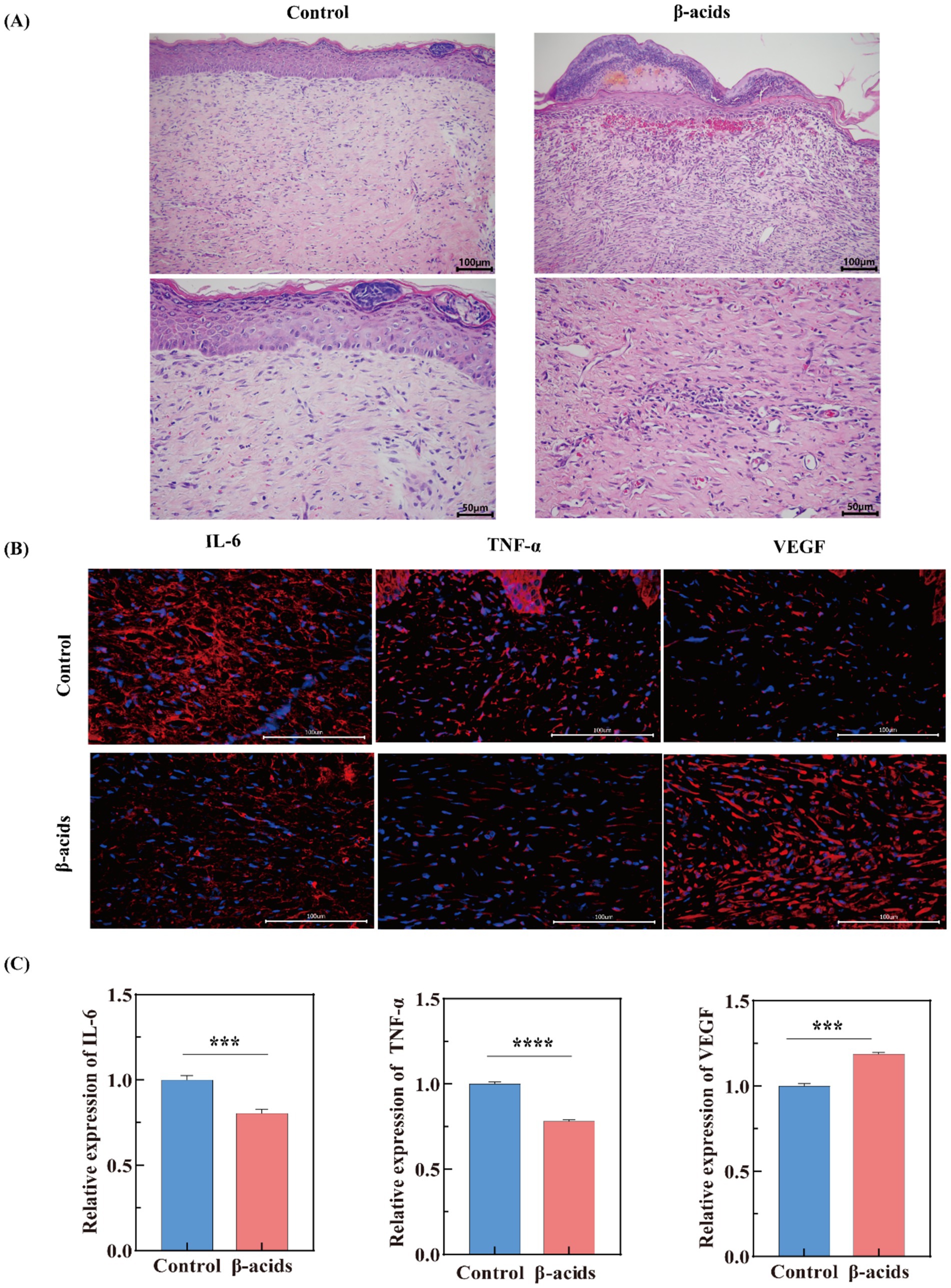 Skin wounds infected by Methicillin-resistant staphylococcus aureus (MRSA) still remain an important clinical challenge. β-acids, secondary metabolites extracted from hops, exhibit a powerful antibacterial effect on MRSA. In this study, the antimicrobial activity of β-acids against MRSA and the corresponding mechanism were studied. The antimicrobial activity results revealed that β-acids was sensitive to MRSA (MIC=62.5 μg/mL and MBC=250 μg/mL). After β-acids treatment, the morphological changes of MRSA, including surface roughness, cellular crumpling, and fracture. The content of extracellular macromolecules, such as nucleic acids and proteins, increased significantly when β-acids treatment was applied, indicating that the integrity and permeability of cell membranes were disrupted. Meanwhile, laser confocal microscopy results showed that the cell membrane was severely damaged. Additionally, β-acids minimized intracellular adenosine triphosphate (ATP), suppressed Na⁺-K⁺-ATPase and Ca²⁺-Mg²⁺-ATPase activities, and accelerated intracellular reactive oxygen species (ROS) accumulation, ultimately inducing bacterial death. The result of transcriptome RNA sequencing suggested that the pathways involved "carbohydrate metabolism", "amino acid metabolism", "energy metabolism", and "translation", were significantly enriched. After the mice were successfully modeled with MRSA-infected wounds, β-acids was administered for 15 days, and faster healing of the wound area was observed in the treated group. H&E staining demonstrated gradual regeneration of dermal and epidermal tissues after β-acids treatment. Immunofluorescence results demonstrated that β-acids accelerated wound healing by markedly reducing IL-6 and TNF-α, increasing VEGF levels, and suppressing infection. Overall, β-acids may be promising agents for the effective treatment of MRSA.