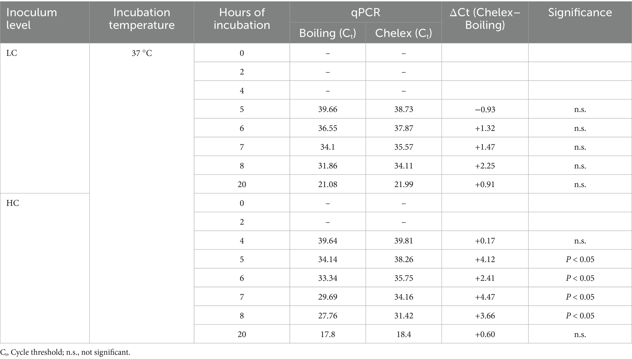 Pairwise comparisons between extraction methods within each inoculum level were performed using paired Student’s t-tests, based on Ct values measured at identical incubation times. In a separate analysis, the effect of sample volume (1 mL vs. 10 mL of homogenate) extracted using the Chelex-100 method was similarly evaluated by paired t-tests to determine whether increasing the extraction volume improved detection sensitivity.