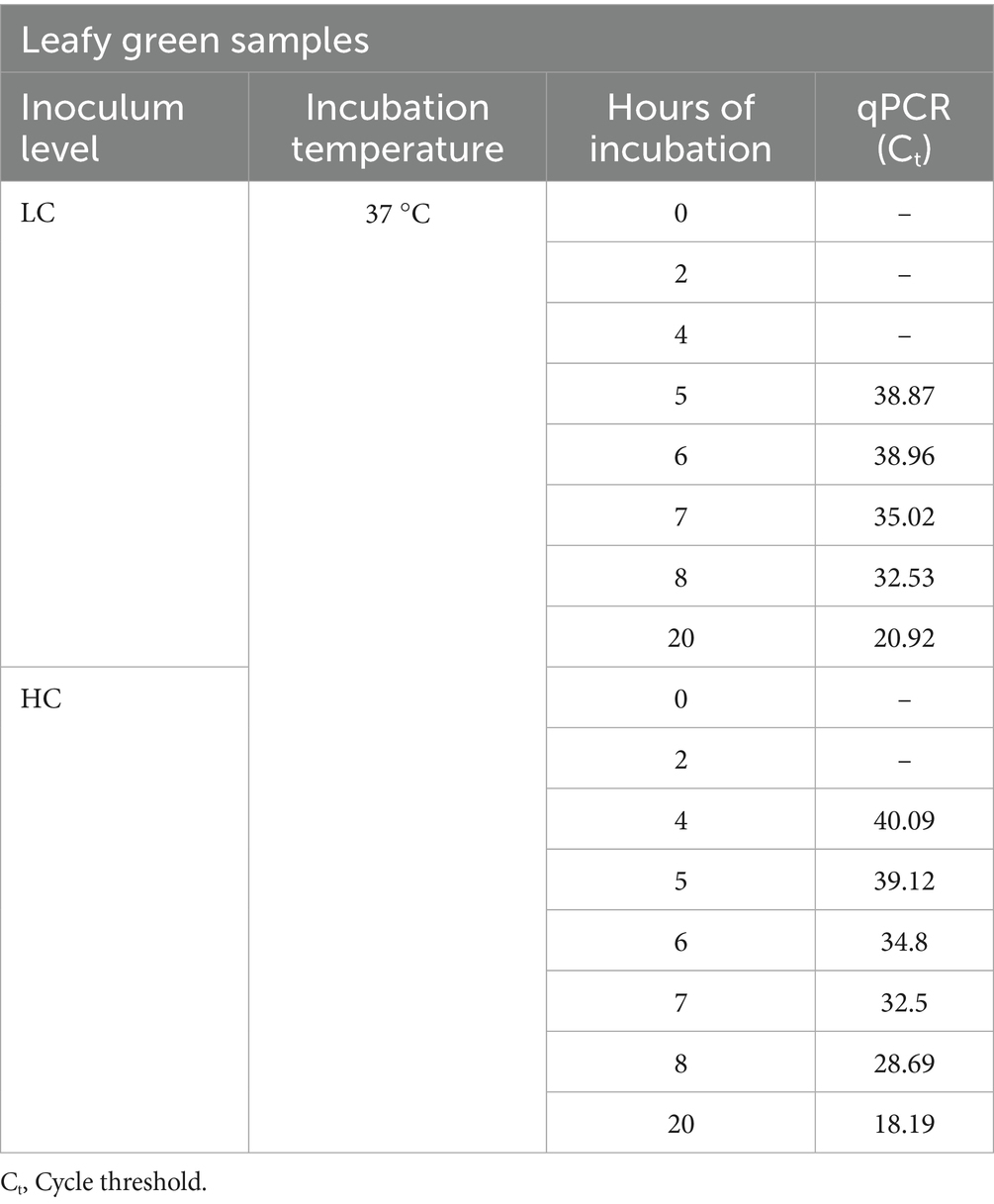 Table 2. Detection of Salmonella by using the Chelex 100 method from 10 mL of homogenate of leafy greens artificially contaminated with two bacterial levels (LC, low = 1–10 CFU/25 g; HC, high = 10–102 CFU/25 g) and incubated for 20 h.