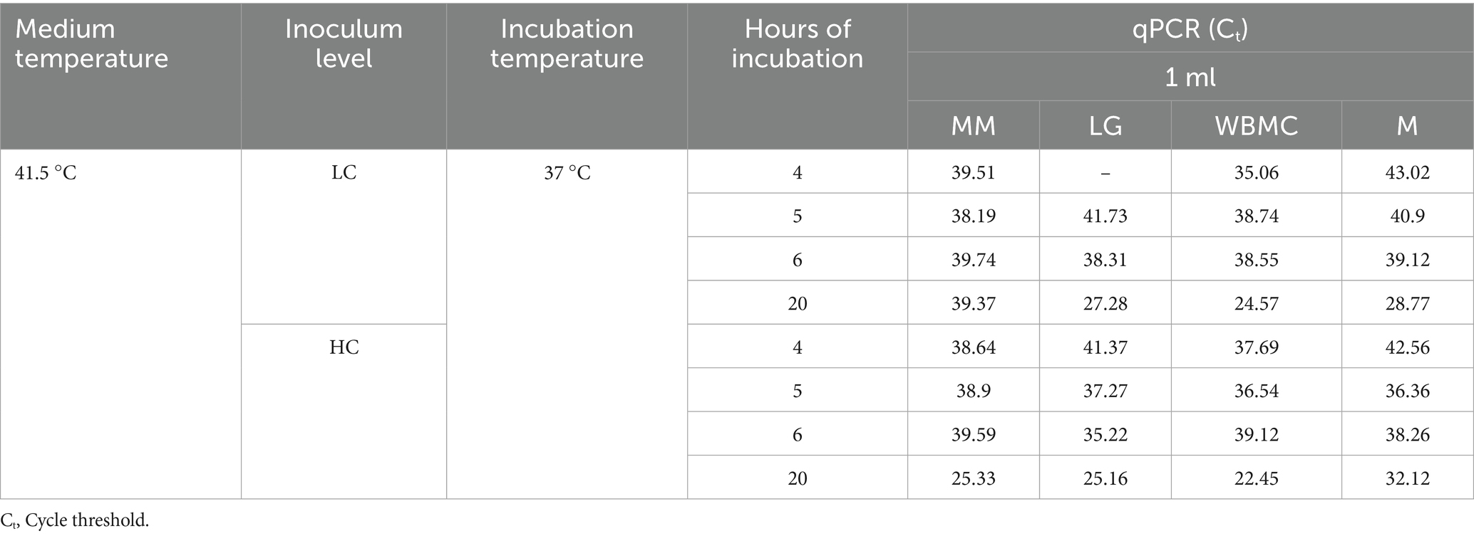 DNA was extracted from 1 of each homogenate after 4 (T-4), 5 (T-5), 6 (T-6), and 20 (T-20) hours of incubation by using the Chelex 100 (section 2.3.2.2) method. Real-time PCR was performed by using the “iQ-Check Real-Time PCR Kit” (section 2.3.3).