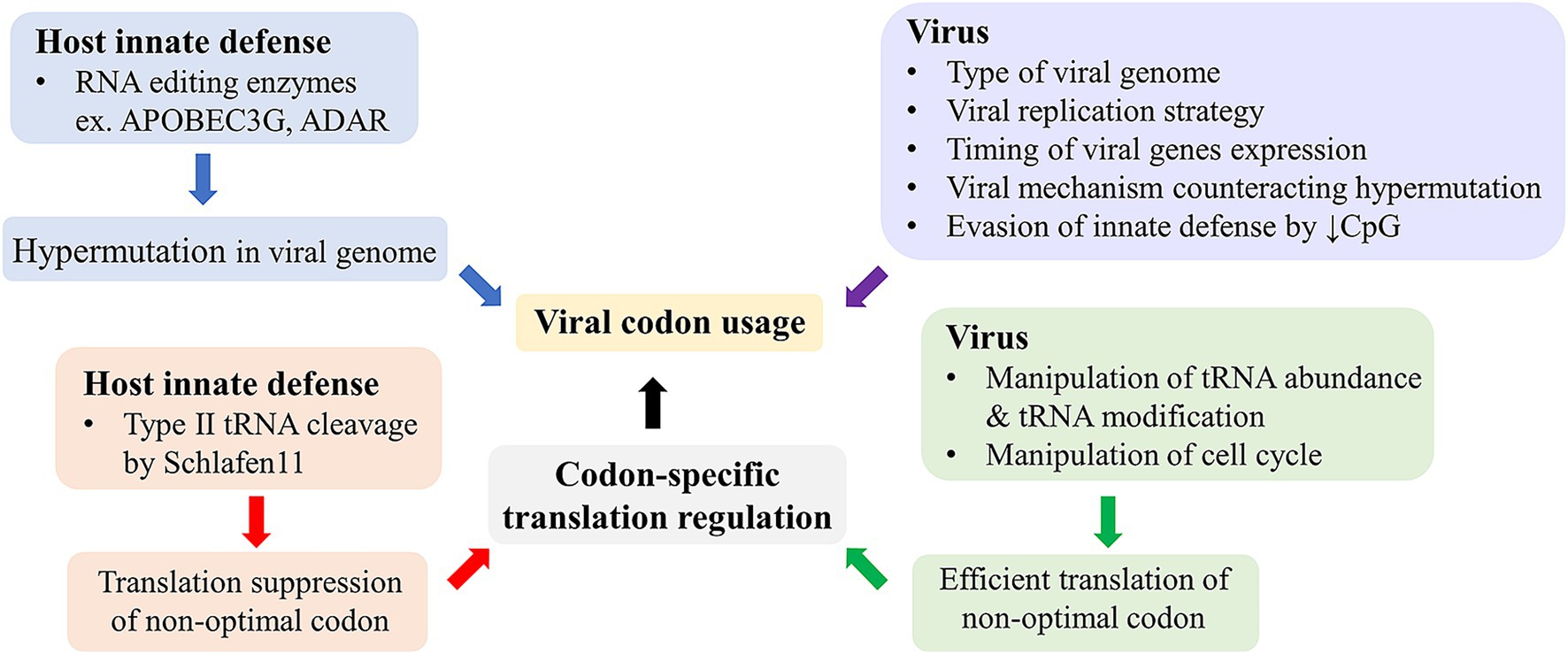 Figure 1. Virus-host interactions and the viral codon usage. Cellular innate defenses in the blue box can drive mutational bias and shape viral codon usage, whereas multiple viral factors in the purple box can influence viral codon usage via various mechanisms. On the other hand, host innate defenses in the red box can suppress viral gene expression in a codon-specific manner, while viruses have specific mechanisms, in the green box, to counteract these host innate defenses and enhance translation of their genes with non-optimal codon usage.