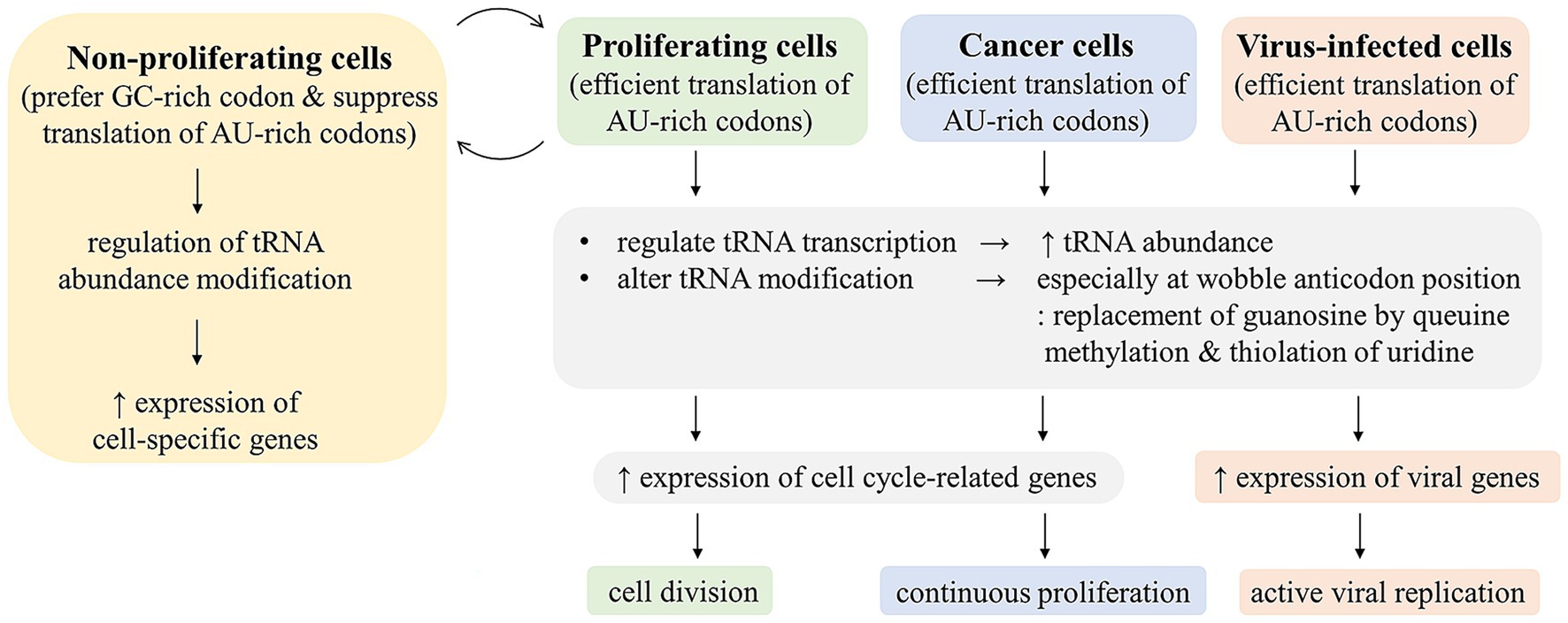 Figure 2. Cellular regulations to facilitate expression of genes with non-optimum codon usage. Most viral and cell cycle-related genes are more AT-rich and have less optimal codon usage than highly expressed human genes. In order to efficiently express these genes with poor codon usage, tRNA pool needs to be regulated for AU-rich codon translation in cancer, proliferating, and virus-infected cells by increasing tRNA abundance and tRNA modification, especially at the wobble anticodon position.