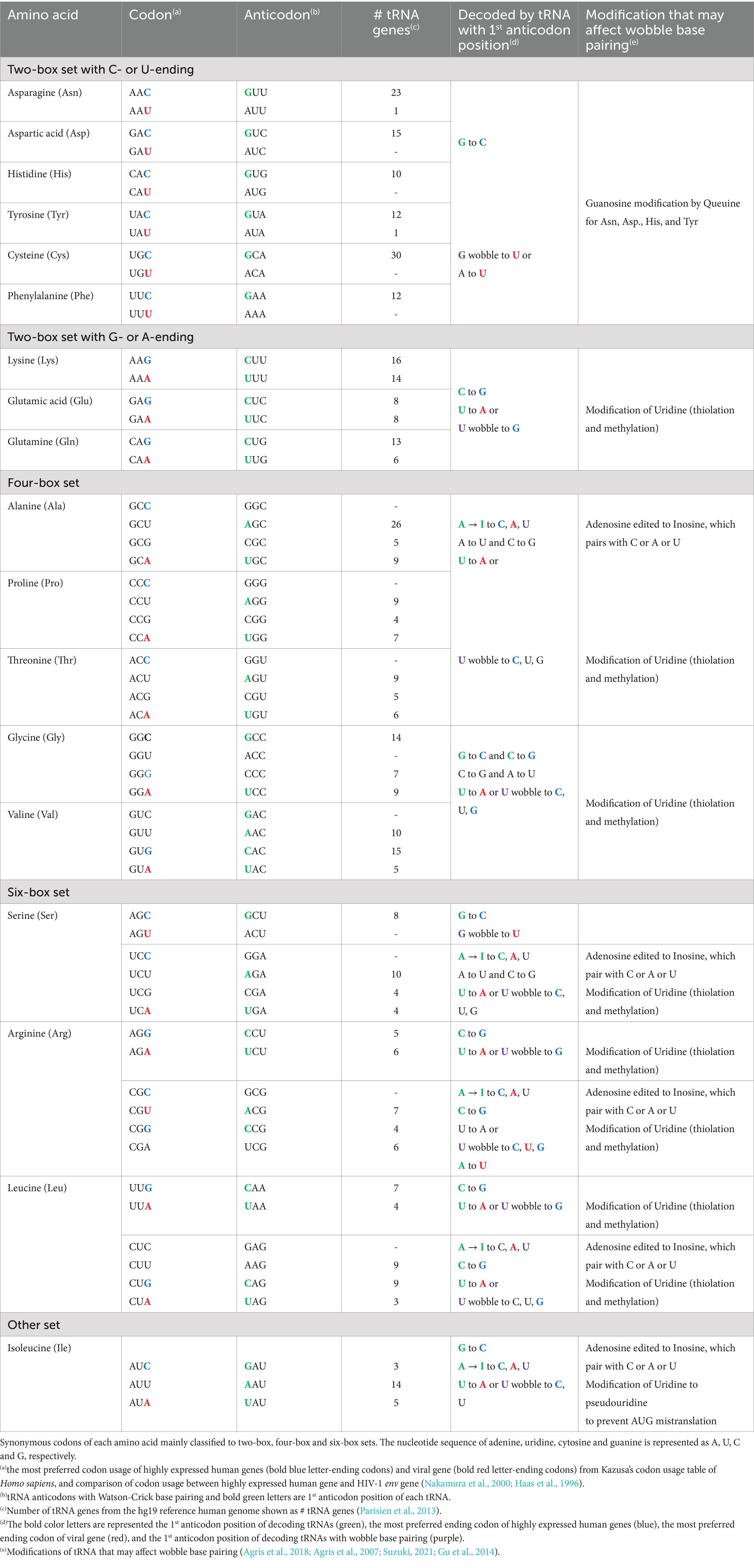 Compatibility between codon occurrence in mRNA and the abundance of tRNA with matched anticodon provide optimal efficiency in translation, and mRNA with non-optimal codon usage cannot be efficiently translated because of the lack of matched tRNA. Adjustment of tRNA pool can therefore at least theoretically provide an additional level of expression regulation. There are multiple tRNA genes with similar anticodons, which are called isodecoder tRNA genes. And because there are multiple codons encoding for the same amino acid, there are multiple tRNA species, which may be different in anticodons, for translation of the same amino acid. These are called isoacceptor tRNA. Relative abundances of isoacceptor tRNAs as indicated by the numbers of tRNA genes partly correlate with the preferred codons of highly expressed human genes (Table 1). In addition, one tRNA species or one anticodon can recognize multiple codons through wobble base pairing (Agris et al., 2018). In wobble base pairing and anticodon - codon recognition; G can pair with U; I (inosine) can pair with U, A and C; and U can pair with all the bases or A and G (Table 1). The extent and preference of wobble base pairing is regulated by tRNA modifications (Agris et al., 2007). These post-transcriptional modifications of tRNA are highly complex and include methylation and thiolation at certain carbon positions of certain nucleotides in certain anticodon and non-anticodon positions of tRNA (Wang and Lin, 2023). There can be multiple modifications in a single tRNA molecule. These modifications regulate stability, translation efficiency and wobble base pairing of tRNA (Wang and Lin, 2023; Suzuki, 2021). Non-translation functions of tRNA and tRNA fragments have been also proposed (Zhang et al., 2023). Studies of these modifications are technically challenging and their regulation and roles in physiology and diseases are not well understood. Improved techniques have recently made it an area of intense investigation. In addition to the tRNA abundance and modification, codon-specific translational regulation can also be mediated by mRNA translation rate and codon-dependent mRNA stability (Presnyak et al., 2015).