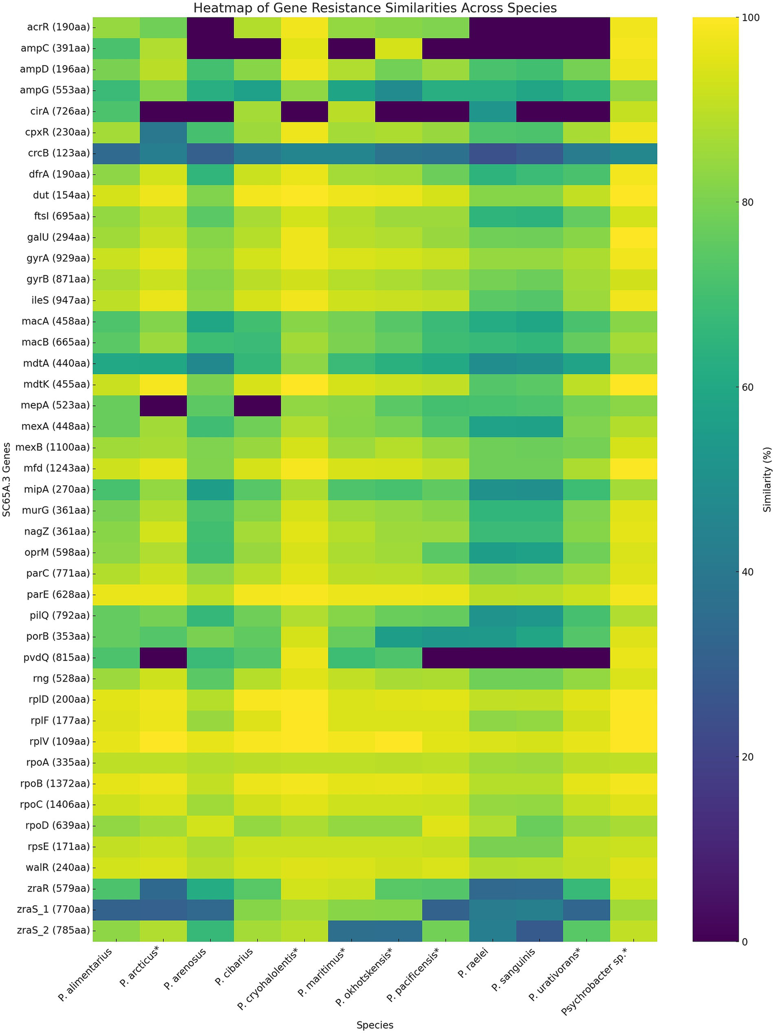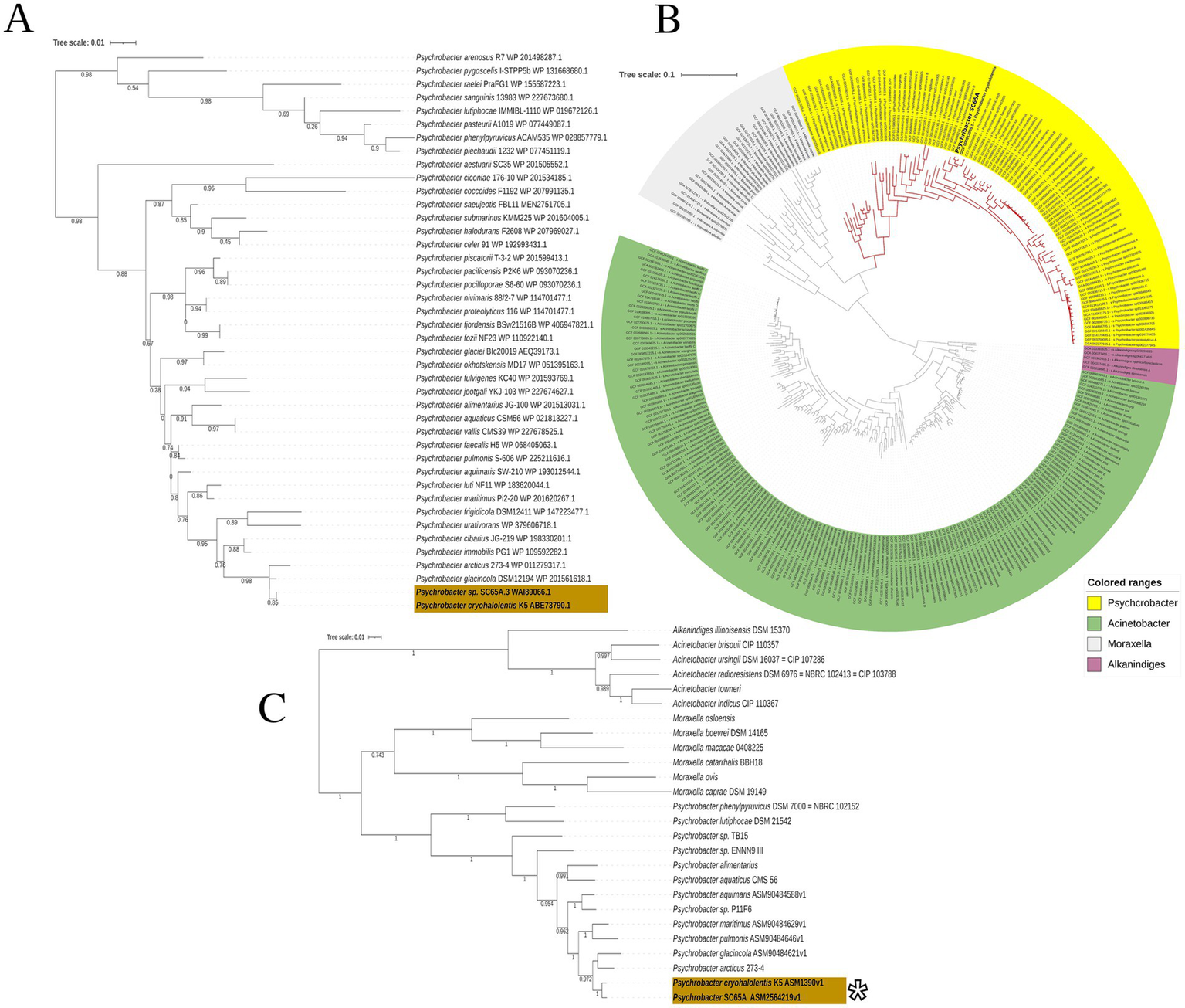 The genus Psychrobacter (family Moraxellaceae, class Gammaproteobacteria) was described in 1986 with P. immobilis as the type species (Juni and Heym, 1986; Juni, 2005). Genomic studies suggest evolutionary adaptation to cold environments from mesophilic ancestors (Bakermans, 2018; Welter et al., 2021). Psychrobacter species have a widespread distribution, found primarily in cold and saline habitats (Rodrigues et al., 2009; Lasa and Romalde, 2017; Kampfer et al., 2020), with 44 of 52 identified species validated (Parte et al., 2020; Schoch et al., 2020). These Gram-variable, non-motile coccobacilli form cream to orange colonies and thrive at low temperatures, however tolerating up to 35–37 °C and varying salinities (Bowman et al., 1997; Juni, 2005; Bowman, 2006; Welter et al., 2021). They are strictly aerobic, catalase- and oxidase-positive, and utilize amino and organic acids as carbon sources while displaying limited biochemical versatility (Denner et al., 2001; Bowman, 2006; Gheorghita et al., 2021). Some species, such as P. sanguinis, P. arenosus, P. faecalis, P. pulmonis and P. phenylpyruvicus are opportunistic human pathogens (Deschaght et al., 2012; Wirth et al., 2012; Caspar et al., 2013; Yang, 2014; Bonwitt et al., 2018; Ioannou et al., 2025), while others, such as P. immobilis or P. glacincola, were found to affect fish species (Hisar et al., 2002; Deschaght et al., 2012; El-Sayed et al., 2023). Recent data show the pathogenic potential of Psychrobacter species, being rarely reported in human clinical samples (Ioannou et al., 2025). The genus holds biotechnological potential due to cold-active enzymes, carbonic anhydrases for bioremediation, and pathways for terpenoid biosynthesis and benzoate degradation, alongside genes for mercury detoxification and toxin resistance (Bull et al., 2000; Rothschild and Mancinelli, 2001; Bowman, 2006; Lee et al., 2016; Li et al., 2016; Lasa and Romalde, 2017; Staloch et al., 2022). The antibiotic resistance profiles of Psychrobacter species remain largely underexplored (Romanenko et al., 2002; Bowman, 2006; Petrova et al., 2009; Bakermans, 2018).