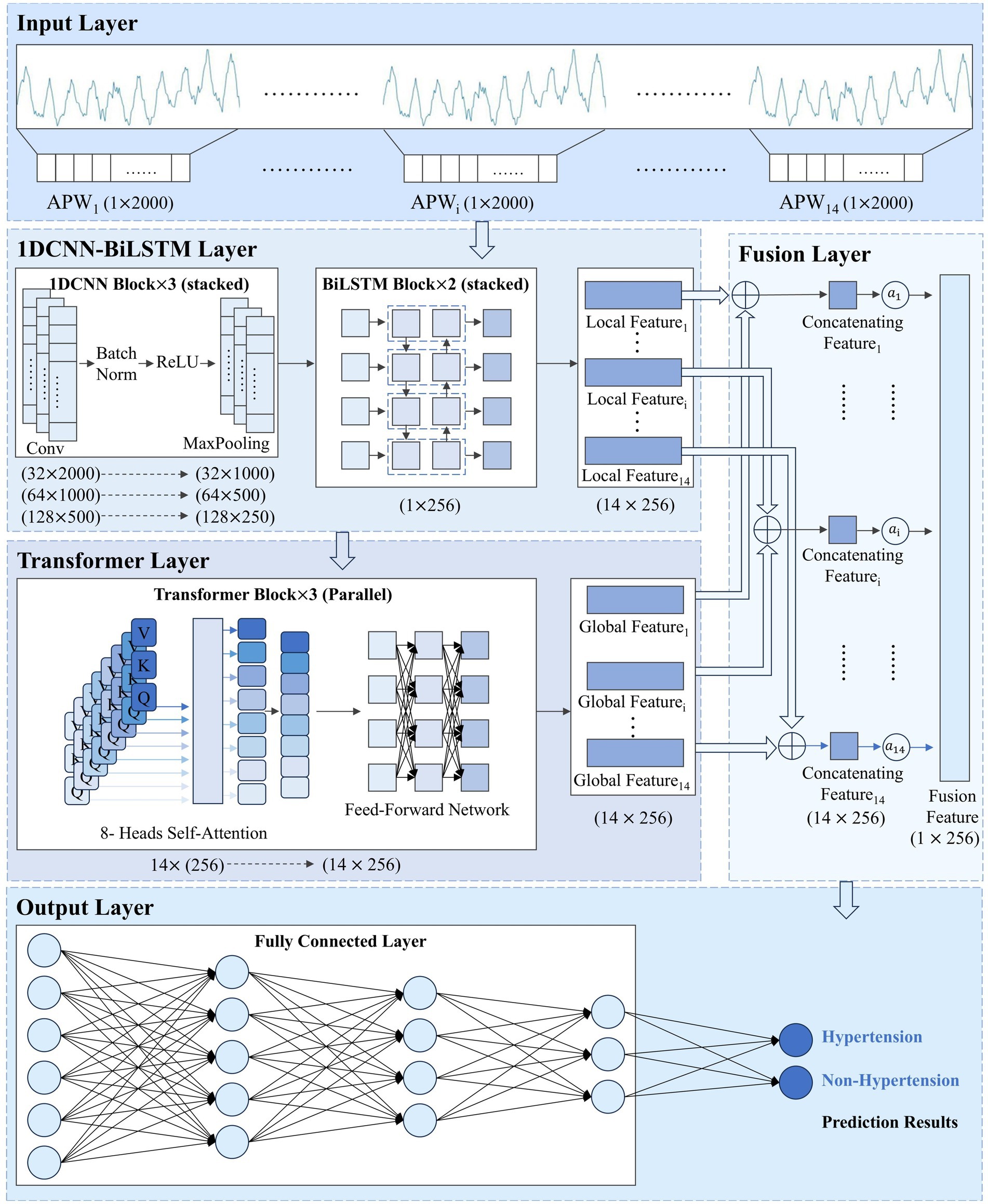 Finally, is fed into the classification module, which consists of three fully-connected layers that perform nonlinear mapping and integration of the fused high-dimensional features. The network ultimately produces a binary prediction indicating either “Hypertension” or “Non-Hypertension,” achieving the automated classification of pulse wave sequence data.