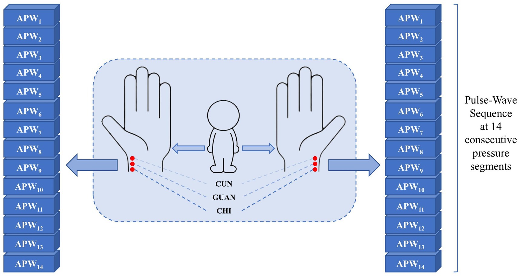 Figure 2. APW signal corresponds to six points (left-cun, left-guan, left-chi, right-cun, right-guan, and right-chi) under 14 step-pressure gradients ranging from 10 to 140 mmHg at 10 mmHg intervals. The Cun, Guan, and Chi are three distinct TCM points on the medial wrist. The APW signal obtained from each point can, respectively, indicate the functional status of different Zang-fu organs.