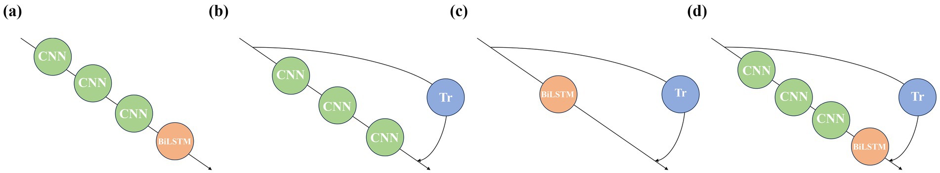 Figure 4. Model architectures corresponding to the ablation experiments: (a) Experiment 1, (b) Experiment 2, (c) Experiment 3, and (d) Experiment 4.