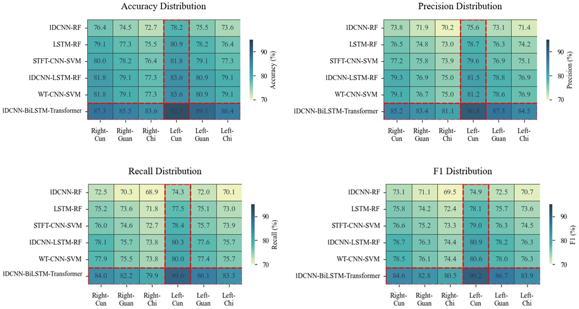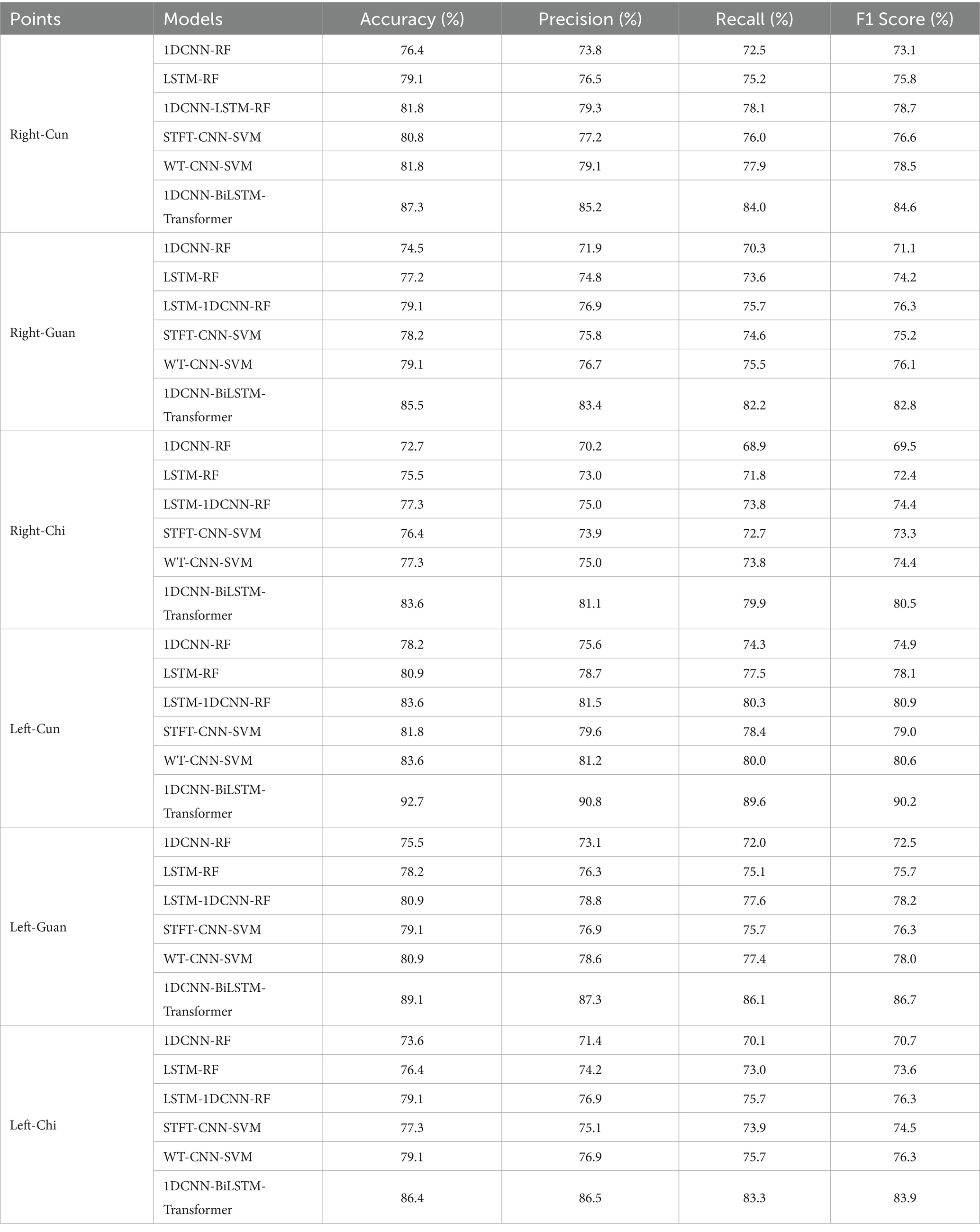 As shown in Figure 5, the performance ranking of the six models at the six collection points from high to low is left-cun, left-guan, right-cun, left-chi, right-guan, and right-chi. The performance of the collection points on the left hand is generally greater than that on the right hand.