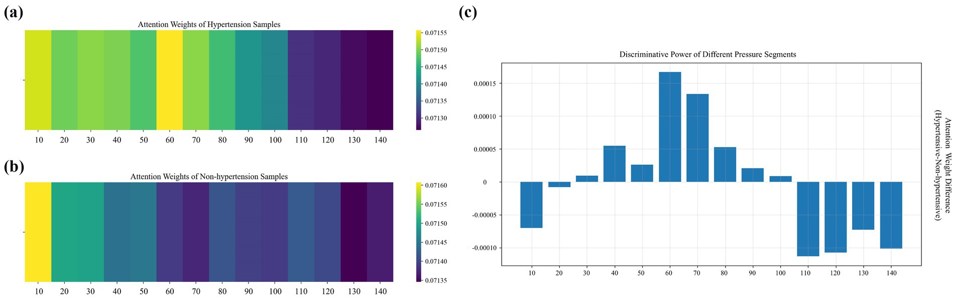 In the medium- and low-pressure range (110–140 mmHg), the attention weights for hypertensive samples are significantly higher than those of non-hypertensive samples, with the differences displaying a fluctuating distribution. These segments correspond to hemodynamic processes spanning from the systolic to the mid-diastolic phase of the cardiac cycle. Due to increased vascular resistance and elevated left ventricular afterload in hypertensive patients, their APW signals in this pressure range often display abnormal features. In contrast, APW signals of non-hypertensive patients in these segments are smoother in this pressure range, and the consistency of their physiological characteristics is higher. Therefore, the model emphasizes the medium- and low-pressure segments of hypertensive samples to capture waveform distortions related to the underlying pathophysiology of hypertension.