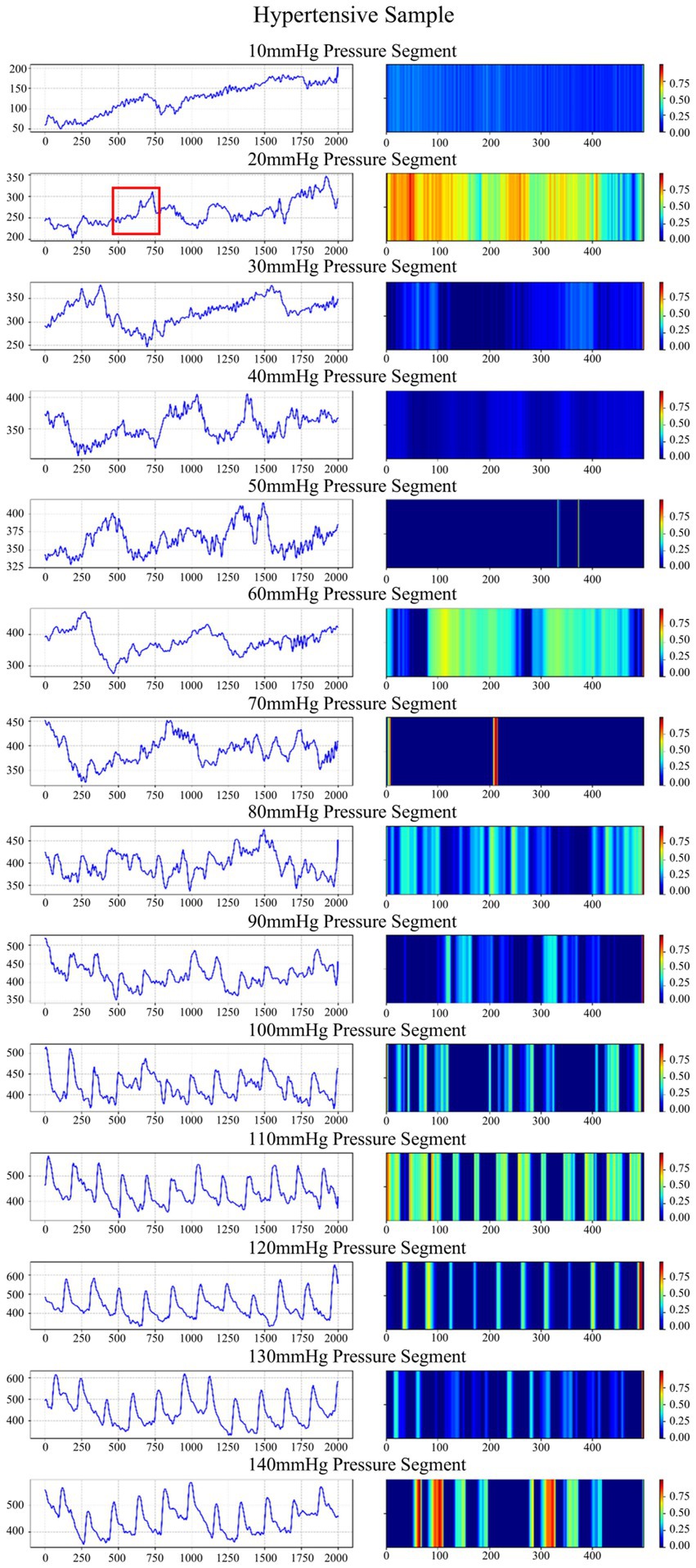 Figure 7. Waveforms and time-frequency heatmaps across 14 pressure segments for a hypertension sample. In the heatmaps, a brighter color indicates a greater weight. The region marked in red corresponds to the waveform with the highest activation in the heatmap.
