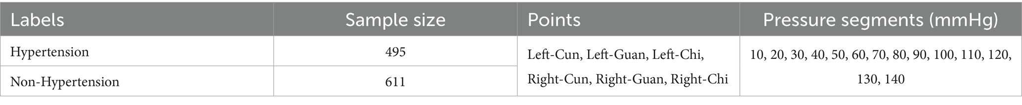 Data collection employed a multi-channel pulse acquisition instrument consisting of an airbag pressurization device and three composite pressure sensors. The acquisition process operates as follows: the airbag pressurization device provides step pressures from 10 to 140 mmHg in 10 mmHg intervals, and the cuff is inflated to generate the specified pressure for approximately 10 s with a 225 Hz sampling frequency at each pressure step, while APW signals and static pressure information from the three sensors are recorded in real time until the next inflation command. In this way, 14-order static pressure values and corresponding APW sequence data from three reference points on each hand under 14 pressure gradients from every subject (495 with hypertension and 611 without hypertension) are collected. These three points are designated as cun, guan, and chi in traditional Chinese medicine, reflecting human body health status across different dimensions. The collection points and results are shown in Figure 2, with dataset details presented in Table 1.