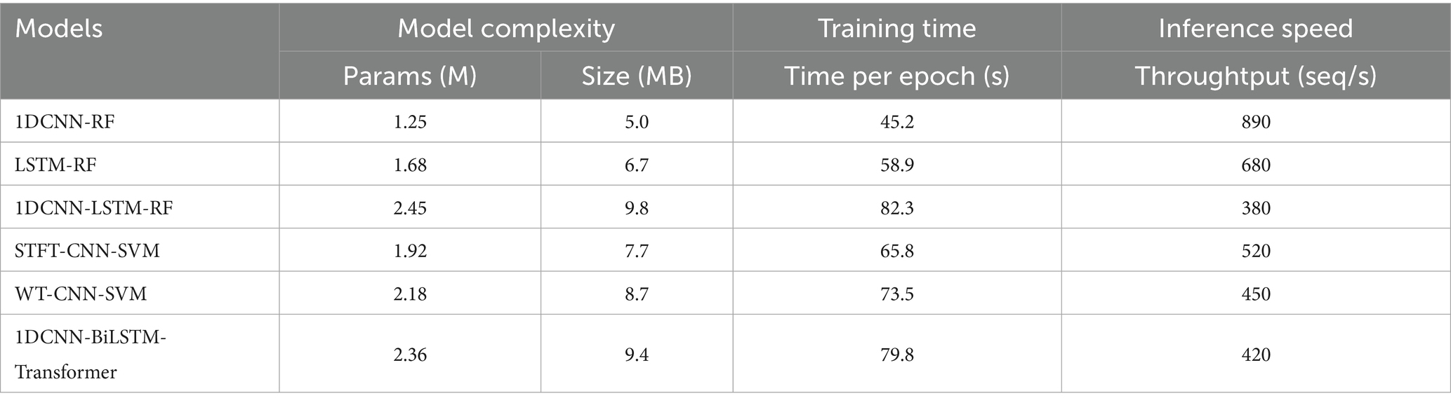 To assess the effectiveness and computational complexity of the 1DCNN-BiLSTM-Transformer model, we compare it against five representative deep learning models commonly used for pulse wave-based hypertension classification (Tables 2, 3).