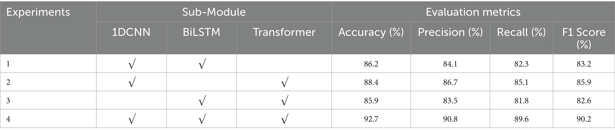 To verify the positive guiding role of each sub-module in the classification process of the 1DNN-BiLSTM-Transformer model, we conduct the ablation experiment with the APW data on the left-cun as the experimental object (Figure 4). The results are shown in Table 4.