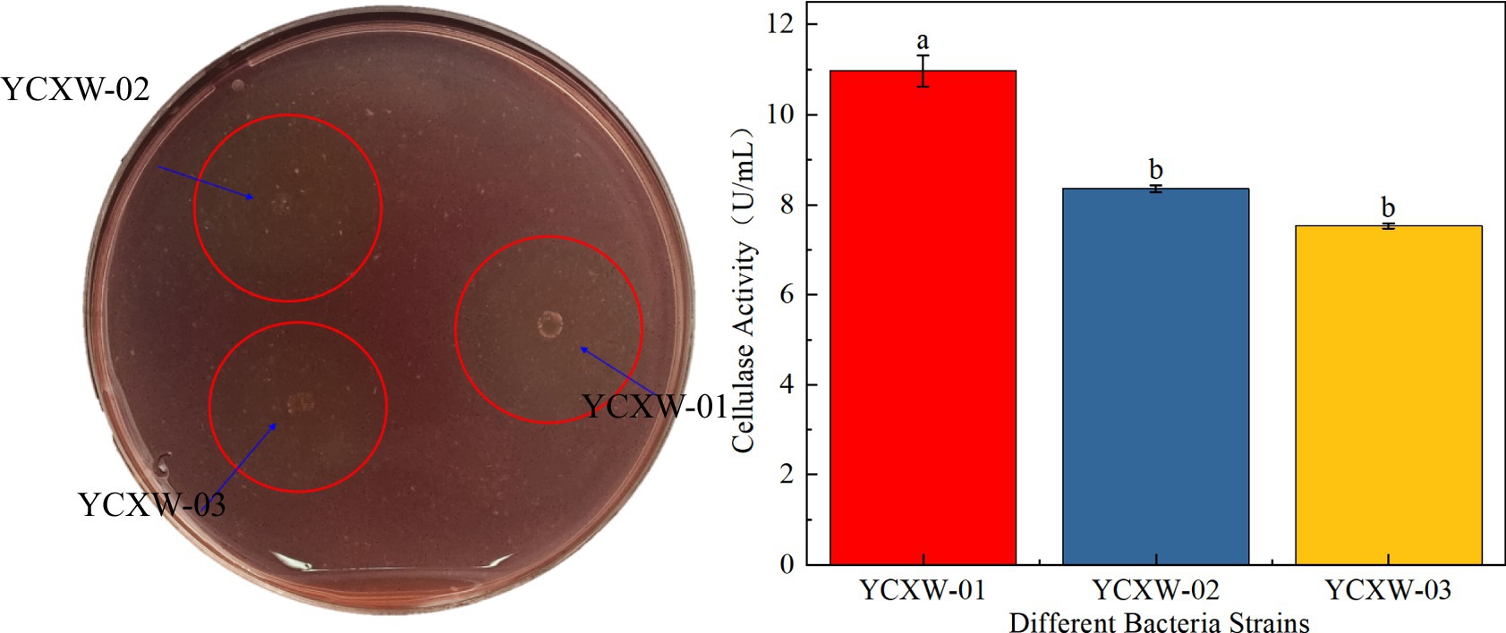 Figure 1. Analysis of cellulase production by strains: (A) CMC plates; (B) cellulase activity. Different lowercase letters indicated that there were significant differences between treatments at the p < 0.05 level (Tukey HSD test).