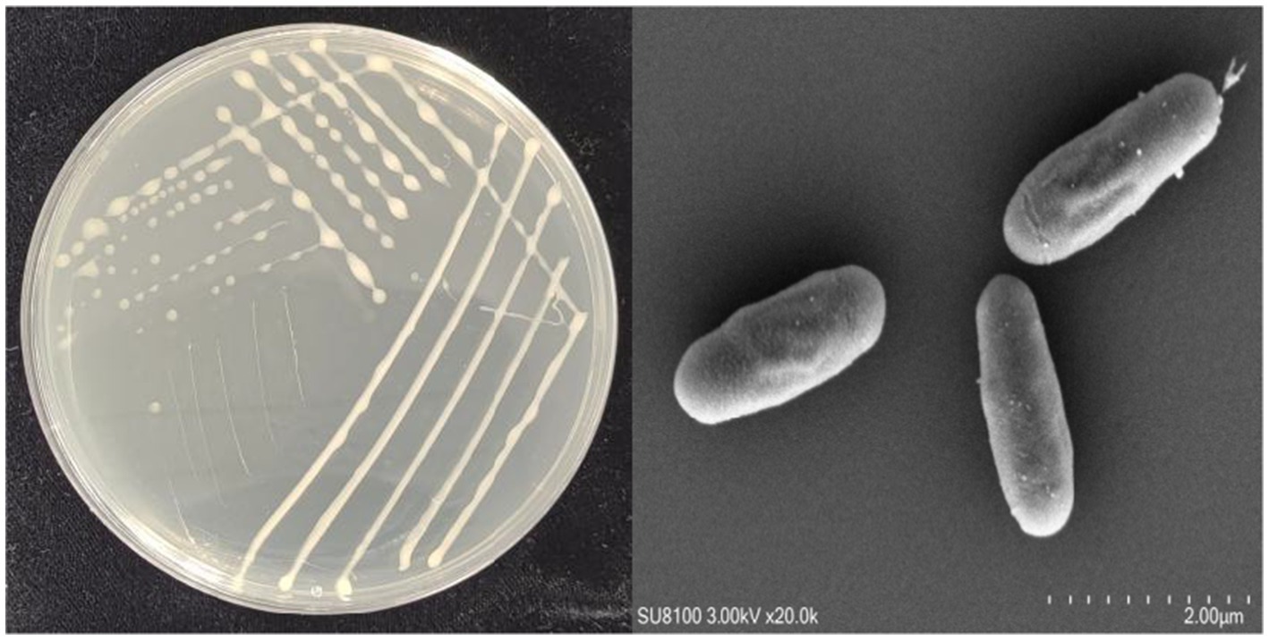 Figure 2. Morphological characteristics of strain YCXW-01: (A) streak plate culture, (B) scanning electron microscope.