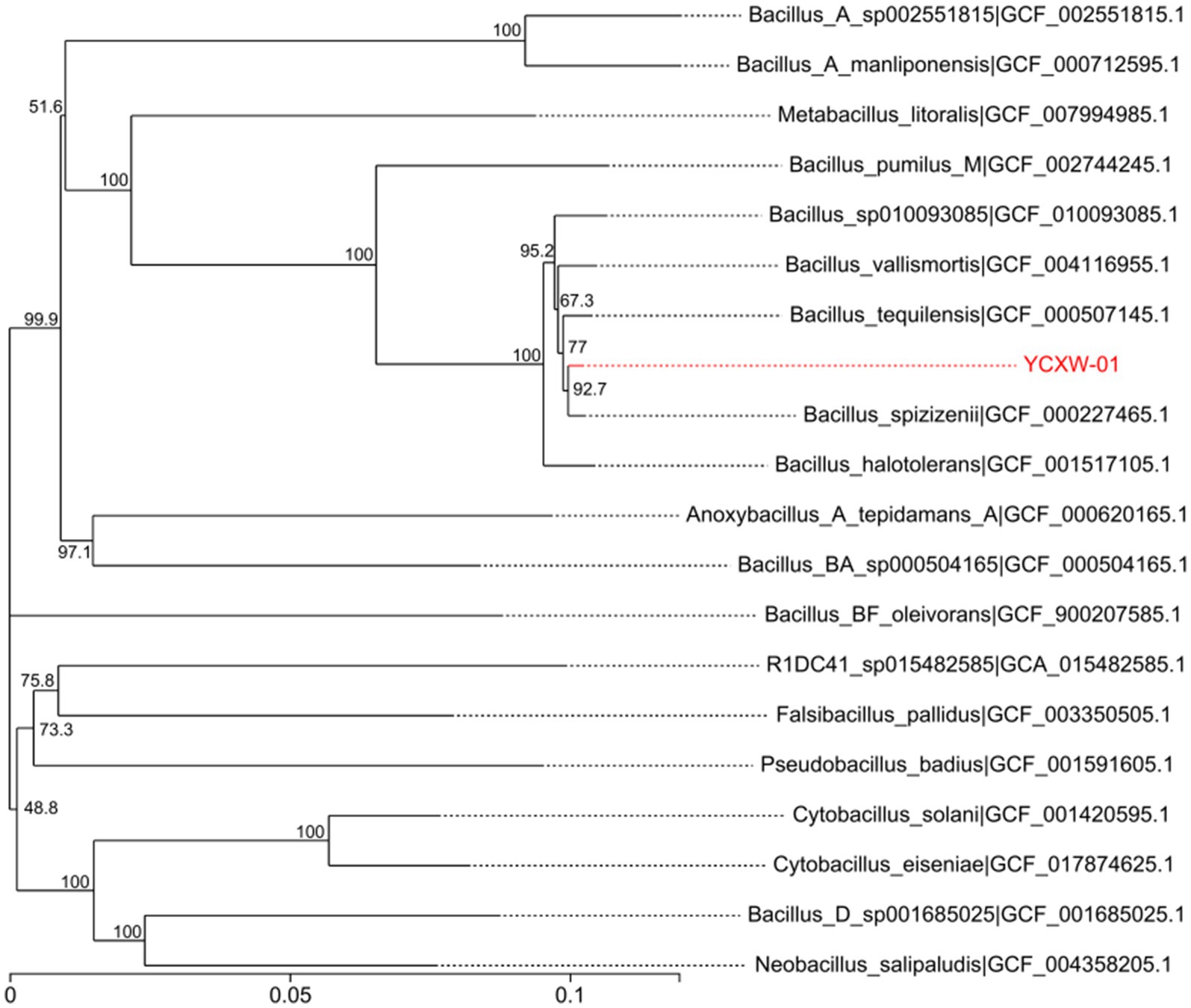 The 16S rRNA gene sequence of YCXW-01 was deposited in the SRA database under accession number SUB15310007. The results of the BLAST analysis and the construction of the phylogenetic tree demonstrated that the strain shared 99% sequence similarity with Bacillus spizizenii (GCF_000227465.1), a member of the Bacillus subtilis species complex (Figure 3). In consideration of the morphological and physiological data, strain YCXW-01 was unequivocally identified as Bacillus subtilis.