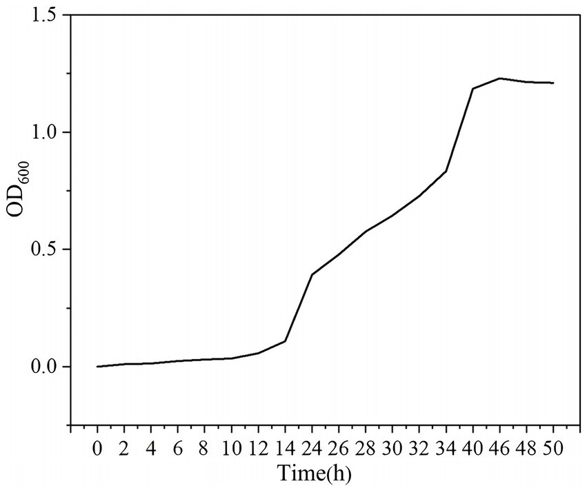 A single colony of the strain was inoculated into 30 mL NB and incubated at 30 °C, 180 rpm for 12 h to prepare the seed culture. The seed culture was then transferred (0.3 mL inoculation, OD600 = 0.01) into fresh NB. During the incubation at 30 °C and 180 rpm, samples were collected at 0, 2, 4, 6, 8, 10, 12, 14, 16, 18, 20, 22, 24, 26, 28, 30, 32, 34, 36, 38, 40, 42, 44, 46, 48, and 50 h. The optical density at 600 nm (OD600) of each sample was measured using a UV spectrophotometer to create a growth curve. The specific growth rate (μ) and the generation time (g) of the strain in the logarithmic growth phase were calculated according to the method of Zhong et al. (2011).