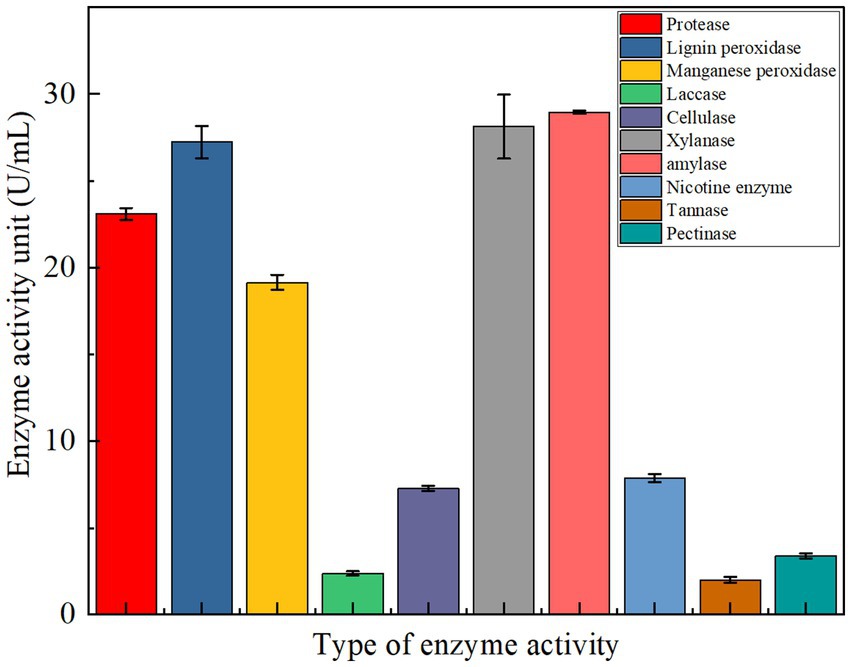 The selected strain was inoculated from an NA plate into 30 mL of NA broth and cultured at 30 °C, 180 rpm for 24 h to prepare the seed culture. The seed culture was then transferred (at a rate of 2% inoculation, OD600 = 0.02) into fresh Nutrient Broth (B), whereupon it was fermented under the same conditions for 24 h. The culture was then centrifuged at 8,000 rpm and 4 °C for 10 min to obtain the crude enzyme. The activities of cellulase was assayed according to the method described by Miller et al. (1960). The determination of protease activity was conducted according to the stipulated protocols outlined in the Chinese National Standard GB/T 23527-2009. The activities of cellulase, amylase, pectinase, and xylanase were measured using the DNS method (Dongdong et al., 2024; Yubo and Xiuyan, 2008; Zhaowei et al., 2013; Lei et al., 2022). The activities of peroxidase and manganese peroxidase were assayed according to the method described by Jing et al. (2021), while laccase activity was determined as referenced by Xiaofeng et al. (2019). The activity of tannase was determined according to the method of Mahmoud et al. (2023). The activity of nicotine dehydrogenase was determined according to the method of Ke et al. (2023).