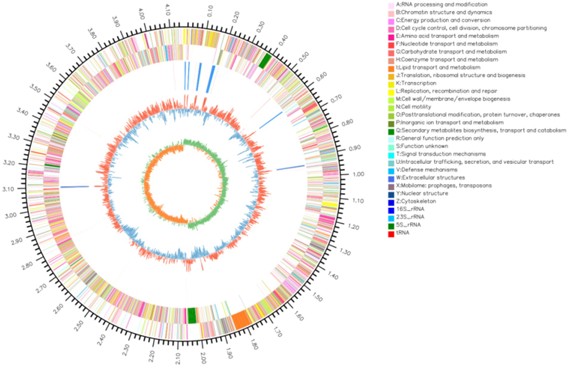 Figure 6. The circular map of strain YCXW-01 completely showed the genomic characteristics. From outside to inside, they were: chromosome region (outermost circle), positive-strand protein-coding gene (second circle), negative-strand coding region (third circle), non-coding RNA (including rRNA and tRNA) (fourth circle), GC content (fifth circle) and GC offset value (sixth circle). The circles of different colors correspond to the coding area categories in the second and third circles, respectively. The color and height of the fifth peak represent the comparison of GC content with the average (red: higher, blue: lower), and the difference value.