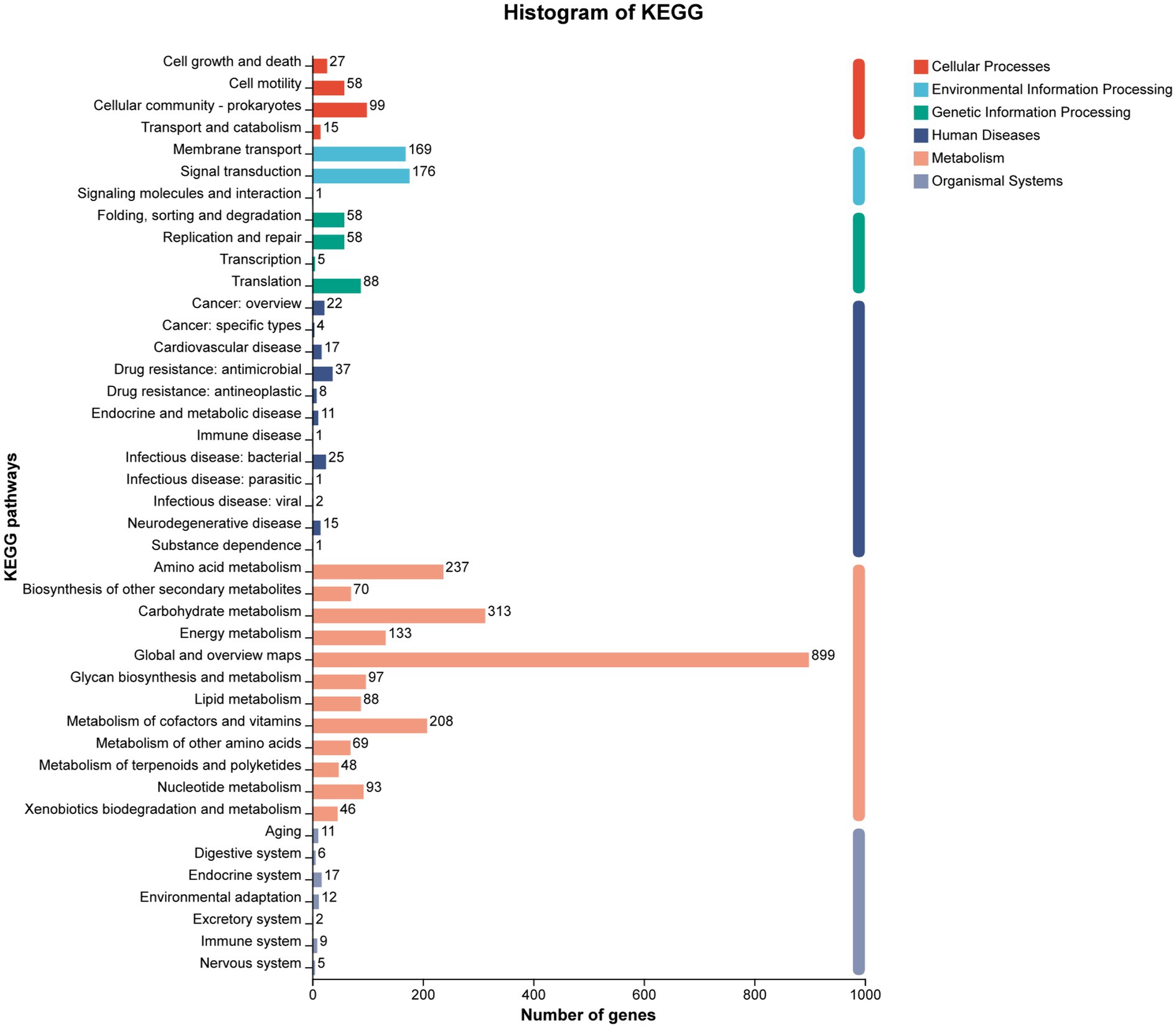 Figure 7. KEGG cluster annotation of strain YCXW-01. The horizontal axis represents the secondary classification of the KEGG pathway, and the vertical axis represents the number of genes labeled under this classification. Columns of different colors correspond to the first-level classification of the KEGG pathway, and the rightmost column shows the number of genes in different levels of classification. Since the same gene may be labeled to multiple secondary classifications, de-redundancy processing is performed when calculating the number of genes in the primary classification.