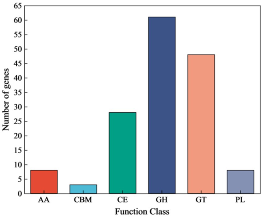 Figure 8. Genome CAZy annotation classification of strain YCXW-01. AA, enzymes with auxiliary activity; CBM, carbohydrate-binding module; CE, carbohydrate esterase; GH, Glycoside Hydrolases; GT, glycosyl transferase; PL, polysaccharide lyase.