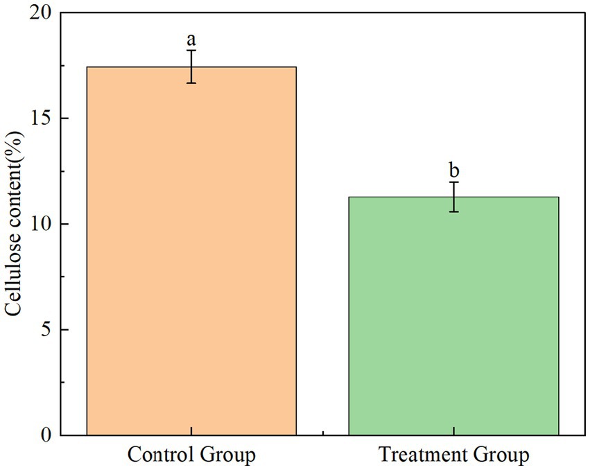 Figure 9. The extracellular crude enzyme solution of strain YCXW-01 actually analyzed the cellulose degradation ability in tobacco stem (the control group was kept under the same conditions without applying the enzyme). Different lowercase letters indicated that there were significant differences between treatments at the p < 0.05 level (Tukey HSD test).