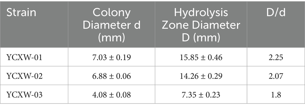 The purified isolates were spot-inoculated onto fresh CMC plates, followed by incubation at 30 °C for a period of 4 days. The preliminary assessment of the cellulolytic activity was conducted by measuring the diameter of the hydrolysis zone (D) and the colony diameter (d). Isolates exhibiting elevated D/d ratios were selected for subsequent analysis. The preparation of seed cultures involved the inoculation of a single colony into NB, followed by incubation at 30 °C with 180 rpm agitation for a duration of 12 h. Thereafter, the seed culture was then transferred (0.3 mL inoculation volume) into 30 mL fresh NB and fermented for a period of 24 h, employing the same conditions as previously outlined. The fermentation broth was centrifuged at 4 °C and 4,000 rpm for 20 min to collect the cell pellet. The resulting suspension was centrifuged at 4 °C and 8,000 rpm for 10 min, and the supernatant was collected as the crude enzyme extract. Carboxymethylcellulase (CMCase) was quantified following the DNS method according to Miller et al. (1960) and to the International Union of Pure and Applied Chemistry with certain modification. Briefly, the main objective of this method is to estimates extent saccharification by measuring the total amount of reducing sugars obtained from the hydrolysis. For cellulase activity determination, each test tube contained 300 μL of 1% (w/v) sodium carboxymethyl cellulose solution (pH = 5.0) and 100 μL of enzyme solution. For pectinase activity determination, the substrate was replaced with 300 μL of 1% (w/v) pectin solution, while the enzyme solution volume (100 μL) remained unchanged. Both mixtures were incubated at 50 °C for 30 min to initiate the reaction. After reaction, 400 μL of 3,5-dinitrosalicylic acid (DNS) solution was added to each tube; the mixtures were heated in a boiling water bath at 100 °C for 5 min and cooled with running water. The solutions were diluted to a final volume of 10 mL, and the absorbance was measured at 540 nm to determine activities, respectively (Yubo and Xiuyan, 2008).