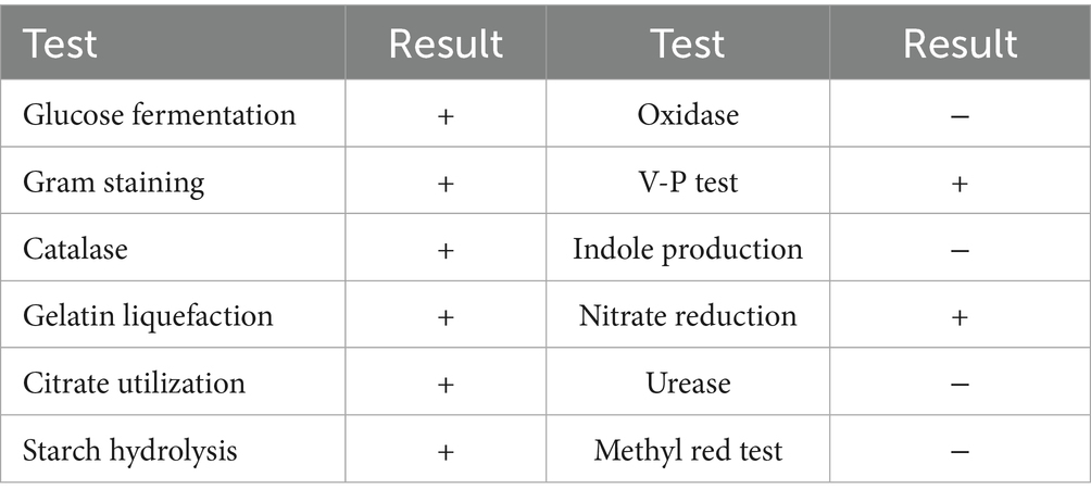 Morphological and physiological biochemical characterization: The isolate was cultivated on NA at 30 °C for 24 h. Morphological observation was conducted using scanning electron microscopy (SEM), as previously described by Zhao et al. (2024). Physiological and biochemical tests were then performed, including glucose fermentation, catalase, oxidase, Voges-Proskauer (V-P), methyl red, starch hydrolysis, gelatin liquefaction, nitrate reduction, citrate utilization, urease, indole production, and Gram staining. These tests were performed according to standard procedures outlined in Bergey’s Manual of Determinative Bacteriology (Buchanan, 1984) and Manual for Systematic Identification of Common Bacteria (Xiuzhu and Miaoying, 2001).