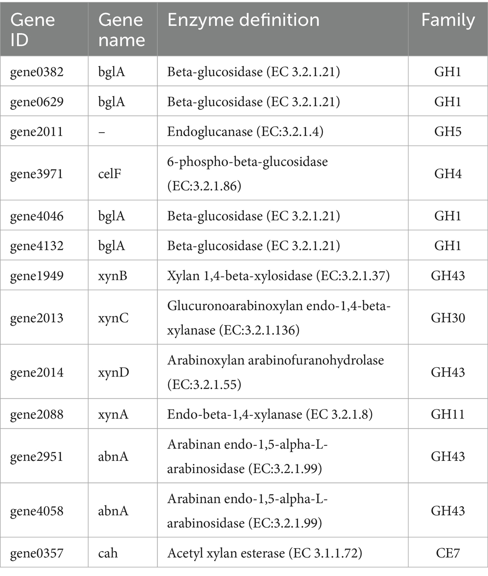 Annotation against the CAZy database identified 148 genes encoding Carbohydrate-Active Enzymes (CAZymes) (Figure 8). These included 61 Glycoside Hydrolases (GHs), 48 Glycosyl Transferases (GTs), and 28 Carbohydrate Esterases (CEs). A detailed analysis was conducted to identify the key genes potentially involved in cellulose and hemicellulose degradation (Table 3). These genes encode enzymes such as beta-glucosidase (GH1), endoglucanase (GH5), endo-1,4-beta-xylanase (GH11), xylan 1,4-beta-xylosidase (GH43), and acetyl xylan esterase (CE7). The GH1 and GH43 families were found to contain the highest number of genes (4 each), thus suggesting their potential pivotal role in the strain’s lignocellulolytic system.