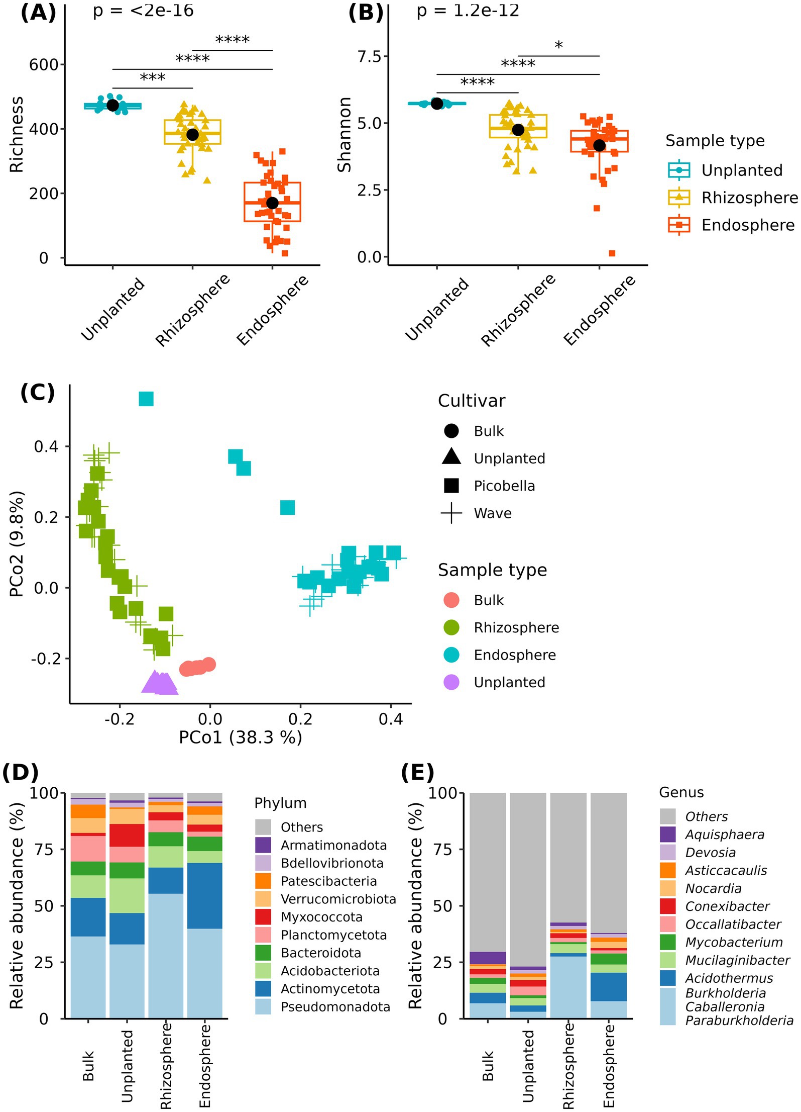 Figure 2. Bacteriome of bulk substrate, unplanted substrate, rhizosphere, and endosphere samples. Rhizosphere and endosphere were collected from petunia ‘Picobella Blue’ and ‘Wave Purple’ grown under three fertilizer rates (25, 100, and 200 mg·L−1 N) for 7 weeks. Unplanted substrate also received three fertilization rates for 7 weeks. Boxplots showing richness (A) and Shannon index (B) across sampling compartments. Each boxplot displays the median (center line), interquartile range (box), mean (black diamonds), and individual data points (n = 7). Asterisks indicate statistically significant differences based on Dunn’s tests (*p ≤ 0.05, **p ≤ 0.01, ***p ≤ 0.001, ****p ≤ 0.0001). Principal coordinate analysis based on the Bray–Curtis distance (C). Relative abundance of major bacterial phyla (D) and genera (E) across sampling compartments.