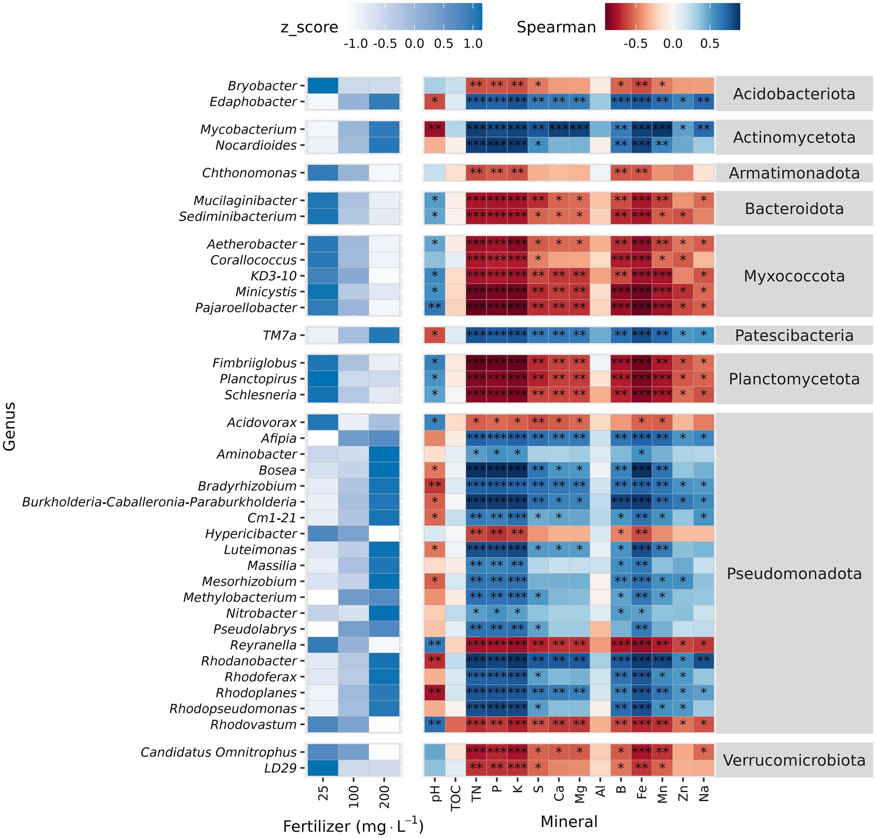 Figure 4. Differential abundance analysis and correlation analysis of unplanted substrate at genus level. Unplanted substrate received three fertilization rates (25, 100, and 200 mg·L−1 N) for 7 weeks. Relative abundance was normalized (Z-normalization) across fertilizer rates for each genus to facilitate visualization of increasing or decreasing trends. Heatmap displaying the normalized relative abundance of differentially abundant genera (left) across fertilizer rates and Spearman correlation between differentially abundant genera and substrate chemical properties (right). Asterisks indicate statistically significant correlations (*p ≤ 0.05, **p ≤ 0.01, ***p ≤ 0.001).