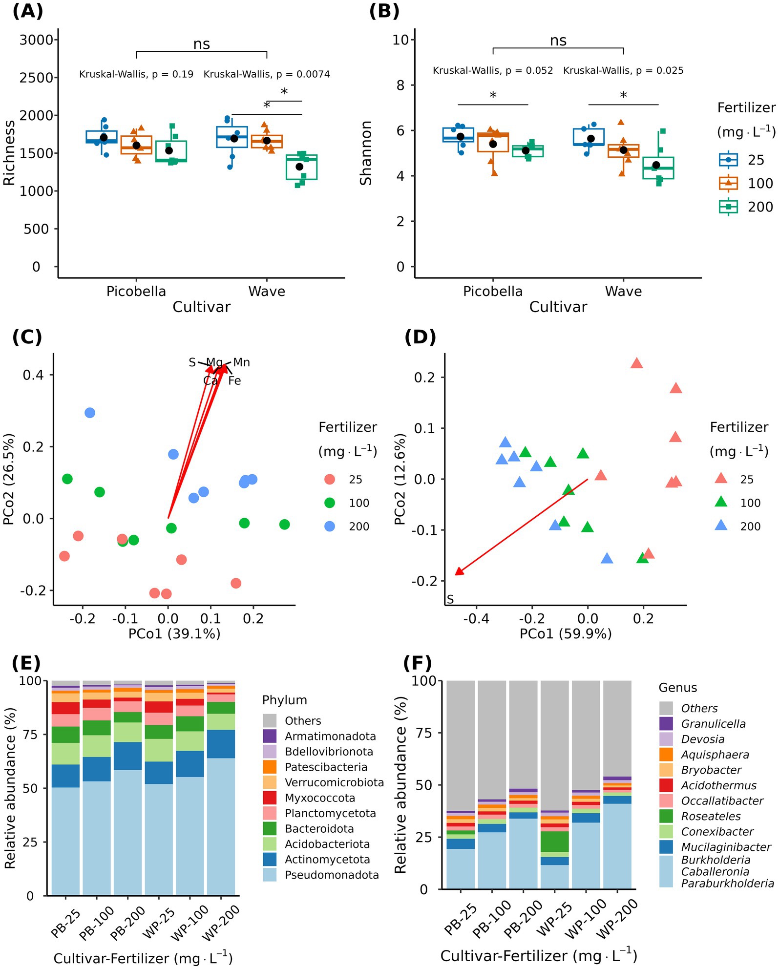Figure 5. Effect of fertilizer rate on the rhizosphere bacteriome of petunia. Rhizosphere samples were collected from petunia ‘Picobella Blue’ and ‘Wave Purple’ grown under three fertilizer rates (25, 100, and 200 mg·L−1 N) for 7 weeks. Boxplots showing richness (A) and Shannon index (B) across fertilizer rates. Each boxplot displays the median (center line), interquartile range (box), mean (black diamonds), and individual data points (n = 7). Top brackets indicate significant differences between the two cultivars (ns p > 0.05). Kruskal-Wallis’ test indicates significant differences between fertilizer rates within each cultivar. Asterisks indicate statistically significant differences between fertilizer rates based on Dunn’s tests (*p ≤ 0.05, **p ≤ 0.01, ***p ≤ 0.001, ***p ≤ 0.0001). Principal coordinate analysis based on the Bray–Curtis distance in petunia ‘Picobella Blue’ (C) and ‘Wave Purple’ (D). Arrows indicate significant correlations between substrate chemical properties and rhizosphere microbial community composition; only variables with an r2 > 0.75 are shown. Relative abundance of major bacterial phyla (E) and genera (F) across fertilizer rates.