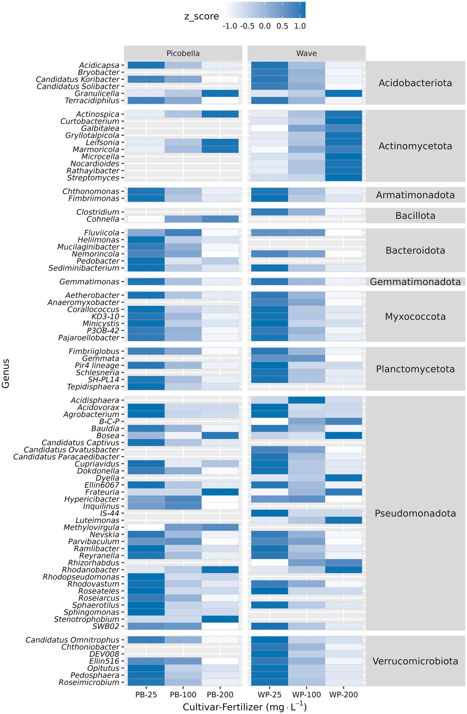 The 10 most abundant genera were Burkholderia-Caballeronia-Paraburkholderia, Mucilaginibacter, Conexibacter, Roseateles, Occallatibacter, Acidothermus, Bryobacter, Aquisphaera, Devosia, and Granulicella (Figure 5F). Krustal-Wallis test identified 57 genera in Picobella and 68 in Wave. Among the differentially abundant genera, 45 were identified in both cultivars. Differentially abundant genera from phylum Verrucomicrobiota (7), Planctomycetota (6), Myxococcota (7), Gemmatimonadota (1), Bacteriodota (6), and Armatimonadota (2) decreased in response to increasing fertilizer rate. In contrast, the 10 differentially abundant genera in phylum Actinomycetota increased with increasing fertilizer rates. Six genera from phylum Acidobacteria were influenced by fertilizer. Acidicapsa, Bryobacter, Candidatus Koribacter, Candidatus Solibacter, and Terracidiphilus decreased as fertilizer rate increased. Only Granulicella increased in response to increased fertilizer rate. Finally, within phylum Pseudomonadota, nine genera increased (Burkholderia-Caballeronia-Paraburkholderia, Bosea, Dyella, Frateuria, Luteimonas, Methylovirgula, Rhizorhabdus, Rhodanobacter and Stenotrophobium) and 24 genera decreased in response to increasing fertilizer rate (Figure 6; Supplementary material 4).