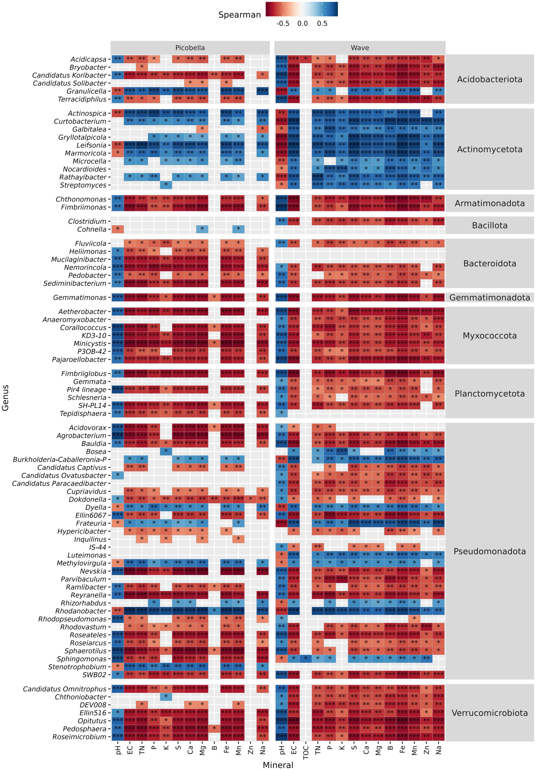 Significant genera that decreased in response to fertilization showed negative correlation with nutrient concentration but positive correlation with pH (Figure 7). In contrast, genera that increased in response to fertilization rate showed positive correlation with nutrient concentration but negative with pH. In Picobella, only a few genera showed significant association to B and Zn. Among differently abundant genera identified in Wave, only two correlated with TOC.