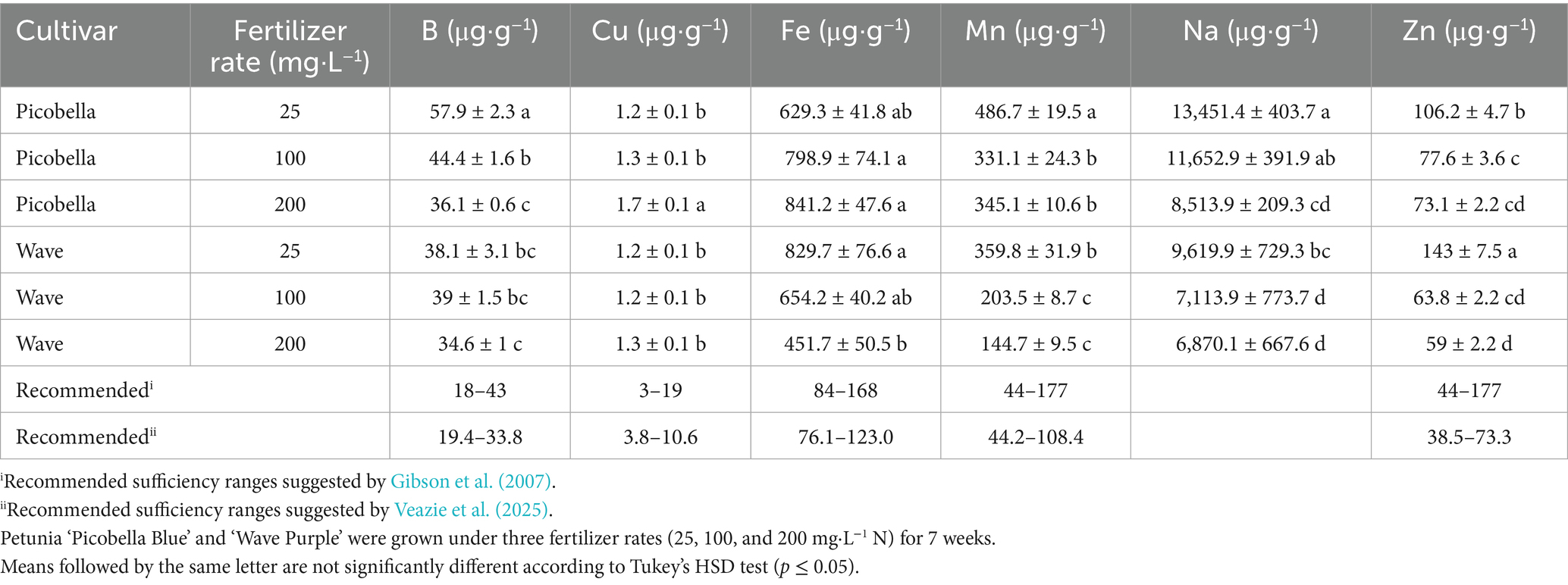 Micronutrient concentration in the shoot tissue depended on cultivar and fertilizer rate. Differences in B tissue concentrations across fertilizer rates were only observed in Picobella. Boron concentration decreased as the fertilizer rate increased (Table 2). Similarly, differences in Cu tissue concentrations across fertilizer rates were only observed in Picobella, but Cu concentration increased as the fertilizer rate increased (Table 2). In contrast, differences in Fe tissue concentrations were only observed in Wave. Iron concentration decreased as the fertilizer rate increased. Manganese, Na, and Zn showed a similar pattern, tissue concentration levels were higher in petunias (Picobella and Wave) fertilized with 25 mg·L−1 N than those fertilized with higher rates (100 and 200 mg·L−1 N). Manganese, Na, and Zn tissue concentrations between the 100 and 200 mg·L−1 N rates were not different (Table 2).