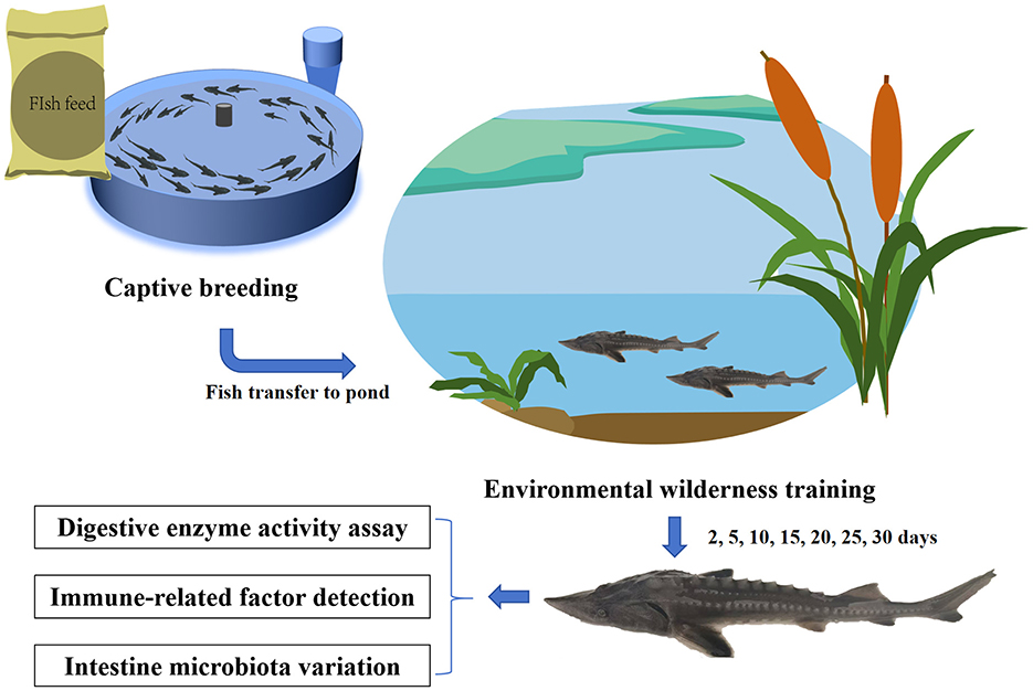 Here, we integrated diet analysis, enzyme assays, immune-gene expression profiling and high-throughput sequencing of gut microbiota to (i) track feeding performance, (ii) compare digestive and immune phenotypes, and (iii) characterize microbial community dynamics of H. dauricus throughout the 30 day environmental acclimation training (Figure 1). This study aims to identify phenotypic and microbiota difference between hatchery-reared and environmentally acclimated H. dauricus, thereby providing a mechanistic framework for the transition from culture to wild-type traits. The findings will provide theoretical underpinnings for strategies to enhance restocking success of H. dauricus and offer novel insights into the conservation and genetic-resource augmentation of wild populations.