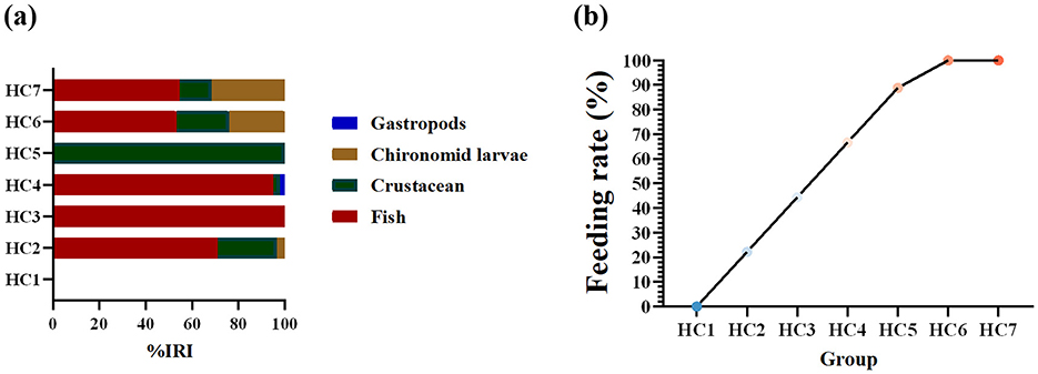 Figure 2. Relative importance index (IRI) percentage of prey species in the diet of Huso dauricus (a). Feeding rate of Huso dauricus during environmental acclimation training (b). HC1: day 2 of environmental acclimation training; HC2: day 5 of environmental acclimation training; HC3: day 10 of environmental acclimation training; HC4: day 15 of environmental acclimation training; HC5: day 20 of environmental acclimation training; HC6: day 25 of environmental acclimation training; HC7: day 30 of environmental acclimation training.