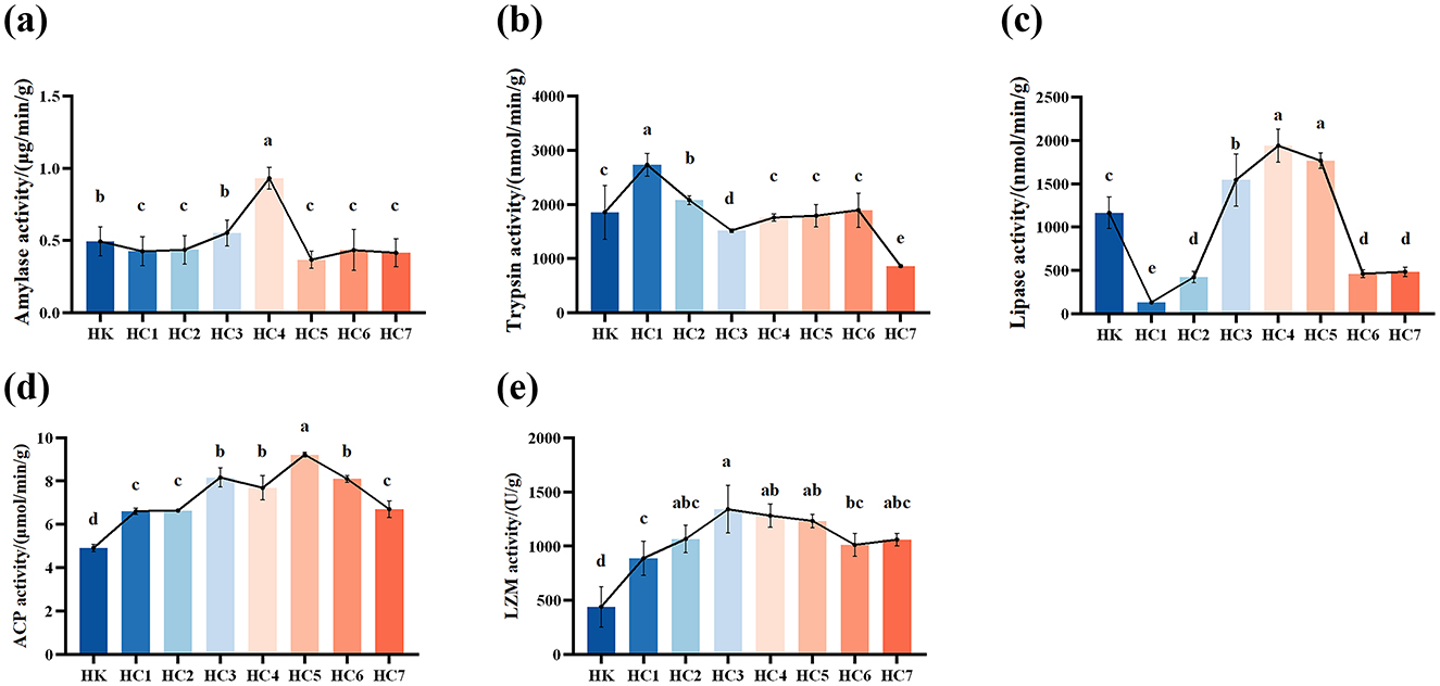 Figure 3. Effects of environmental acclimation training on digestive function and immunity of Huso dauricus. (a) Amylase activity. (b) Trypsin activity. (c) Lipase activity. (d) Acid phosphatase (ACP) activity. (e) lysozyme (LZM) activity. Bars represent mean ± SD; n = 9 individuals per group. Different small letters above the bars indicate significant differences (P < 0.05) in different groups. HK: cultured group; HC1: day 2 of environmental acclimation training; HC2: day 5 of environmental acclimation training; HC3: day 10 of environmental acclimation training; HC4: day 15 of environmental acclimation training; HC5: day 20 of environmental acclimation training; HC6: day 25 of environmental acclimation training; HC7: day 30 of environmental acclimation training.