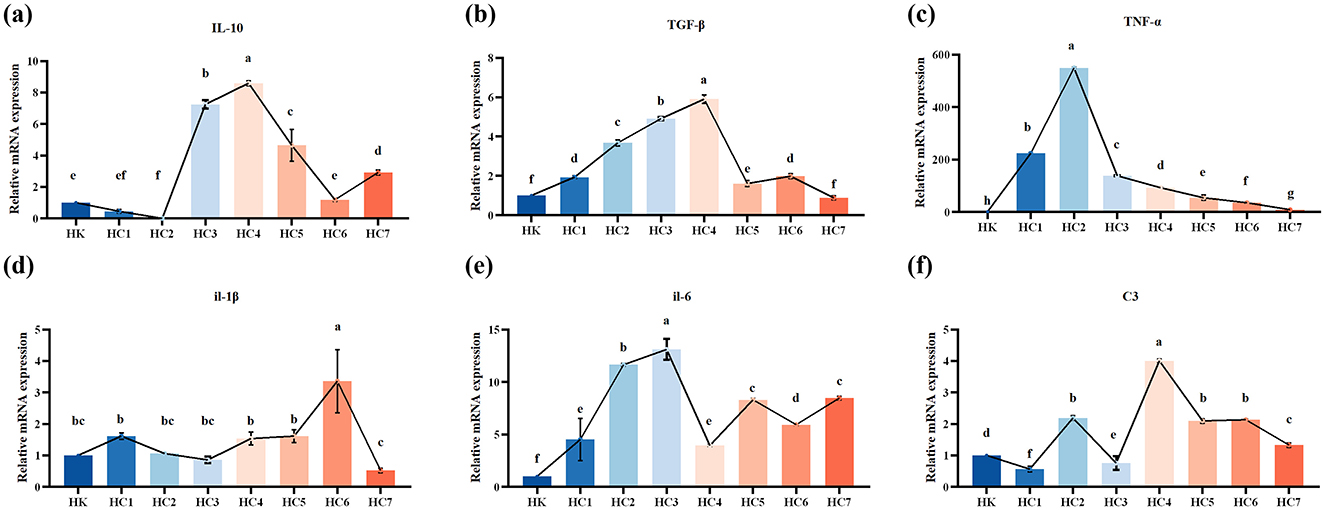 Figure 4. The mRNA expressions of immune-related genes in the intestine of the cultured (HK) and environmental acclimation training (HC) Huso dauricus. (a) Interleukin-10 (IL-10); (b) Transforming growth factor-beta (TGF-β); (c) Tumor necrosis factor-alpha (TNF-α); (d) Interleukin-1beta (IL-1β); (e) Interleukin-6 (IL-6); (f) Complement 3 (C3). Different small letters above the bars indicate significant differences (P < 0.05) in different groups. HK: cultured group; HC1: day 2 of environmental acclimation training; HC2: day 5 of environmental acclimation training; HC3: day 10 of environmental acclimation training; HC4: day 15 of environmental acclimation training; HC5: day 20 of environmental acclimation training; HC6: day 25 of environmental acclimation training; HC7: day 30 of environmental acclimation training.