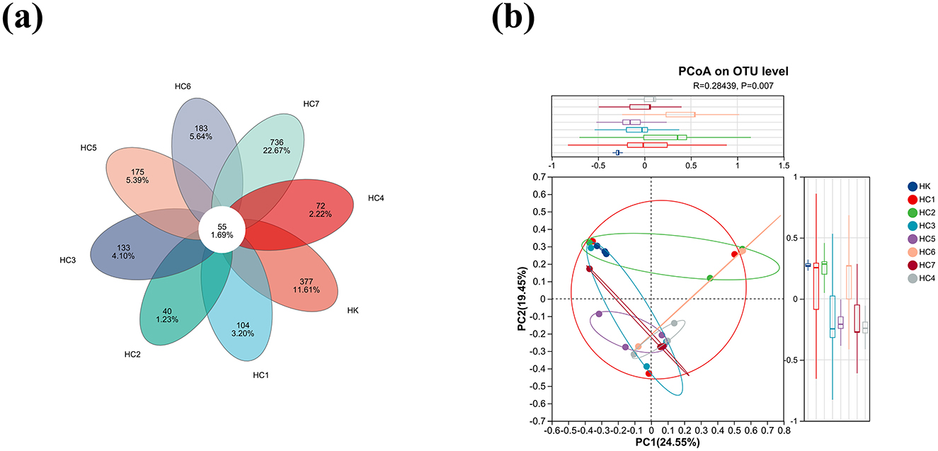 As shown in Figure 5a, a total of 3,355 OTUs were detected across the eight groups. Among them, 432, 159, 95, 188, 127, 230, 238, and 791 unique OTUs were recorded in HK, HC1, HC2, HC3, HC4, HC5, HC6, and HC7, respectively, while 55 OTUs were shared by all groups (Figure 5a). The large difference in OTU counts between HK and HC7 indicates a pronounced divergence in microbial composition between the two groups. Meanwhile, Principal-coordinate analysis (PCoA) based on weighted UniFrac distances revealed a clear separation for microbiota between the HK and HC7 groups (P < 0.05; Figure 5b), indicating that environmental acclimation induced a substantial shift in community composition and increased microbial richness.