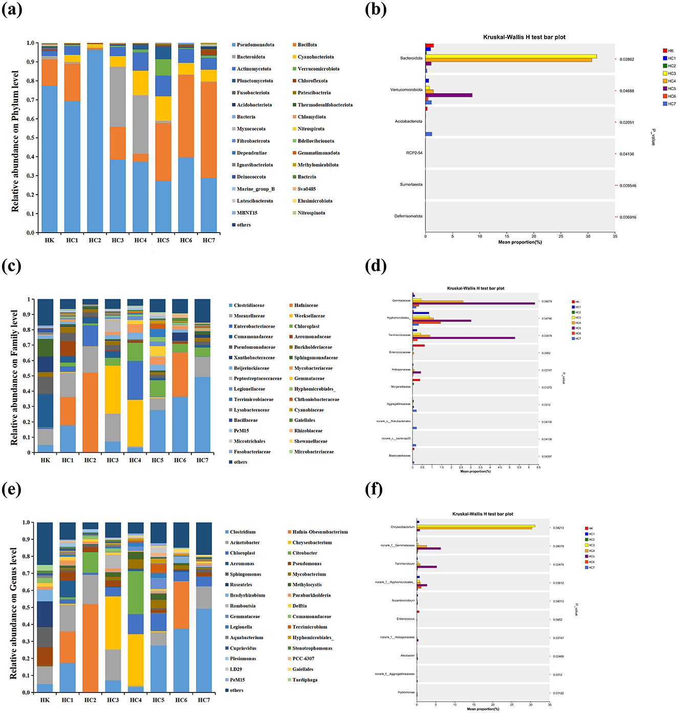 At the family level (Figure 6c), Comamonadaceae dominated the HK group (21.80%), whereas Hafniaceae prevailed in HC1 (18.63%) and HC2 (52.03%). Weeksellaceae became the most abundant family in HC3 (31.24%) and HC4 (30.32%), and Clostridiaceae dominated HC5 (27.69%), HC6 (36.41%) and HC7 (49.24%). Notably, the relative abundance of Weeksellaceae increased markedly in HC3 and HC4 groups (P < 0.05).