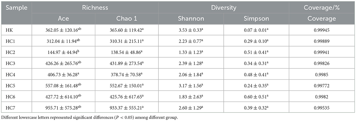 Alpha-diversity indices of the intestinal microbiota for the HK and HC groups are presented in Table 2. Good's coverage exceeded 99.50% for all samples, indicating that sequencing depth was sufficient and the sampling of the intestinal microbiota was close to complete. Ace and Chao1 indices were highest in the HC7 group, followed by HC3-HC6, and lowest in HC2. Shannon and Simpson indices showed no significant differences between the HK and HC groups (P > 0.05).