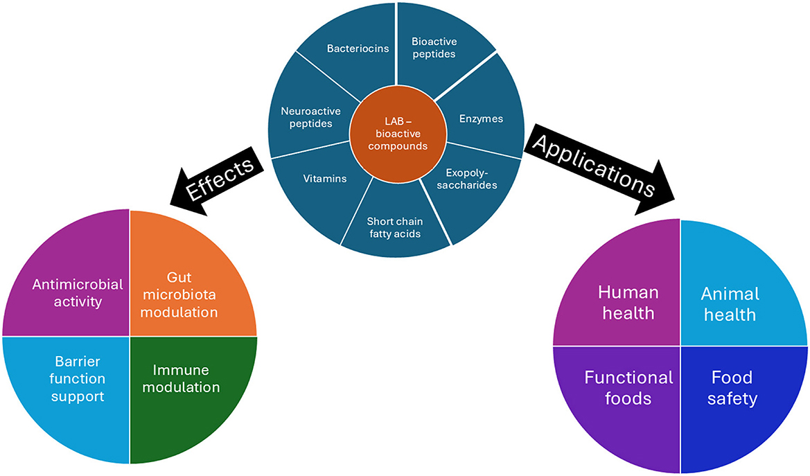 Lactic acid bacteria (LAB) are Gram-positive, usually non-motile, catalase-negative, aerotolerant rods or cocci with high tolerance to low pH that produce lactic acid by fermentation of carbohydrates. Lactic acid bacteria have many therapeutic and functional properties that are beneficial to human health. Homofermentative LAB mainly produce lactic acid from hexose sugars. Facultative heterofermentative also ferment glucose to produce lactic acid, but can also ferment pentose sugars to acetic acid, ethanol, and formic acid. Heterofermentative LAB produce lactic acid and ethanol or acetic acid and carbon dioxide (Bintsis, 2018; Sharma et al., 2020). According to the new taxonomic note some of the main genera include Lactobacillus, Limosilactobacillus, Lacticaseibacillus, Lactiplantibacillus, Levilactobacillus, Furfurilactobacillus, Acetilactobacillus, Lactococcus, Pediococcus, Leuconostoc, Streptococcus, Enterococcus, Oenococcus, Aerococcus, Carnobacterium, Vagococcus, Weissella (Zheng et al., 2020). The mechanisms and applications in human, animal, and food health of the microbial bioactives are noted in Figure 1.