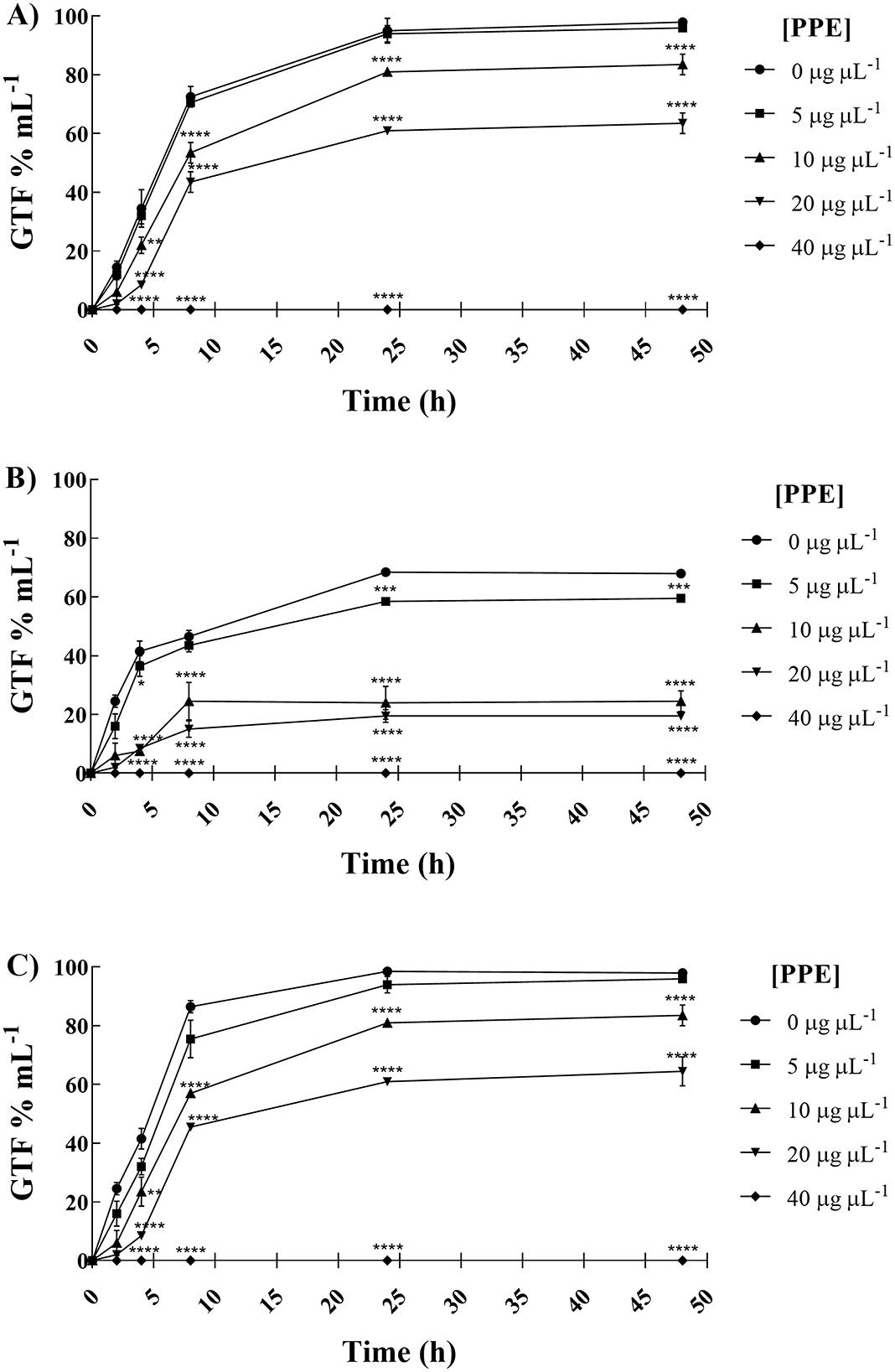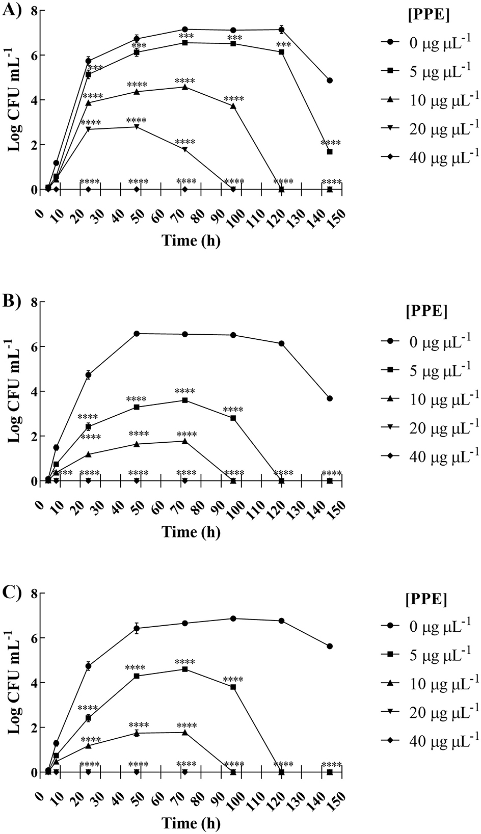 As shown in Figure 1A, a fungistatic effect was observed for C. albicans UGPCA25 isolate when treated with 5 μg μL−1 of PPE. The exposure to 10 and 20 μg μL−1 of PPE caused a significant reduction of fungal survival of C. albicans isolate in the first 24 h, achieving fungal cell death at the end of the observation time (Figure 1A). Moreover, with a concentration of 40 μg μL−1, a fungicidal effect was observed already after 8 h of exposure. For C. glabrata UGPCG25 isolate, the assay showed a reduction in fungal viability over time even at concentrations of PPE corresponding to 5 and 10 μg μL−1, up to obtaining a fungicidal action upon exposure to 20 and 40 μg μL−1 (Figure 1B). Similarly, the same trend has been recorded for C. parapsilosis UGPCP25 isolate (Figure 1C). Overall, these findings clearly indicate that the hydroethanolic PPE is able to effectively in vitro antagonize the growth of fungal urogenital pathogens.