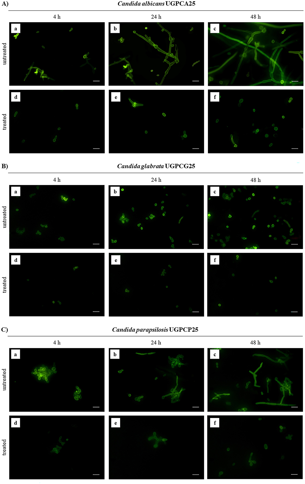 Figure 4. Germ tube formation by Candida isolates untreated and treated with hydroethanolic pomegranate peel extract (PPE) at 4, 24, and 48 h. (A) C. albicans UGPCA25 untreated (a–c) and PPE-treated (d–f); (B) C. glabrata UGPCG25 untreated (a–c) and PPE-treated (d–f); (C) C. parapsilosis UGPCP25 untreated (a–c) and PPE-treated (d–f). Image acquisition via Nikon ECLIPSE Ti fluorescence microscope (40X objective, 0.65 NA, S, WD 0.53 mm) and NIS-Elements C software. Scale bar: 10 μm.